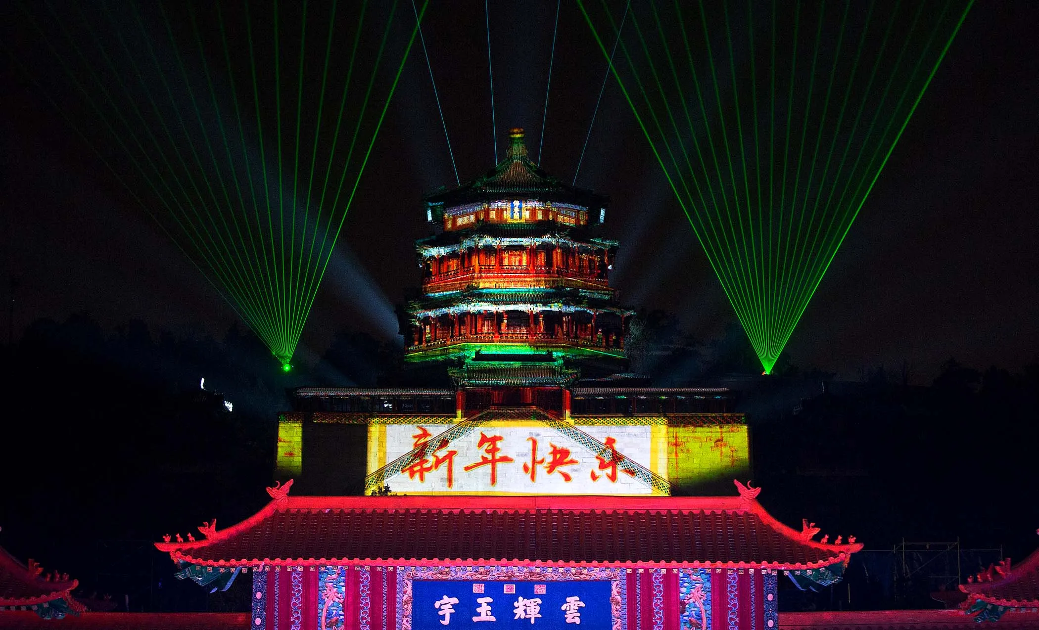 The pavilion of the Summer Palace is illuminated with lights and the words “Happy New Year” during a count-down event in Beijing. (Photo by Andy Wong/Associated Press)