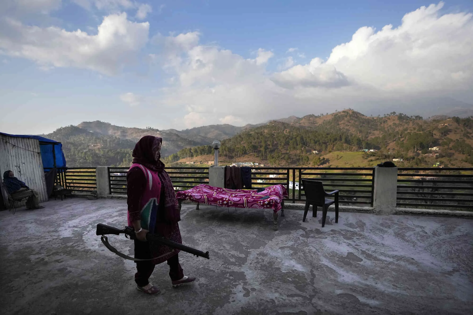 Village Defense Group member Usha Raina holding a gun stands on the rooftop of her house at Kalal Khas Village, in Rajouri, India, February 7, 2023. Days after seven Hindus were killed in the village in disputed Kashmir, Indian authorities revived a government-sponsored militia and began rearming and training villagers. The militia, officially called the “Village Defense Group”, was initially formed in the 1990s as the first line of defense against anti-India insurgents in remote villages that government forces could not reach quickly. (Photo by Channi Anand/AP Photo)