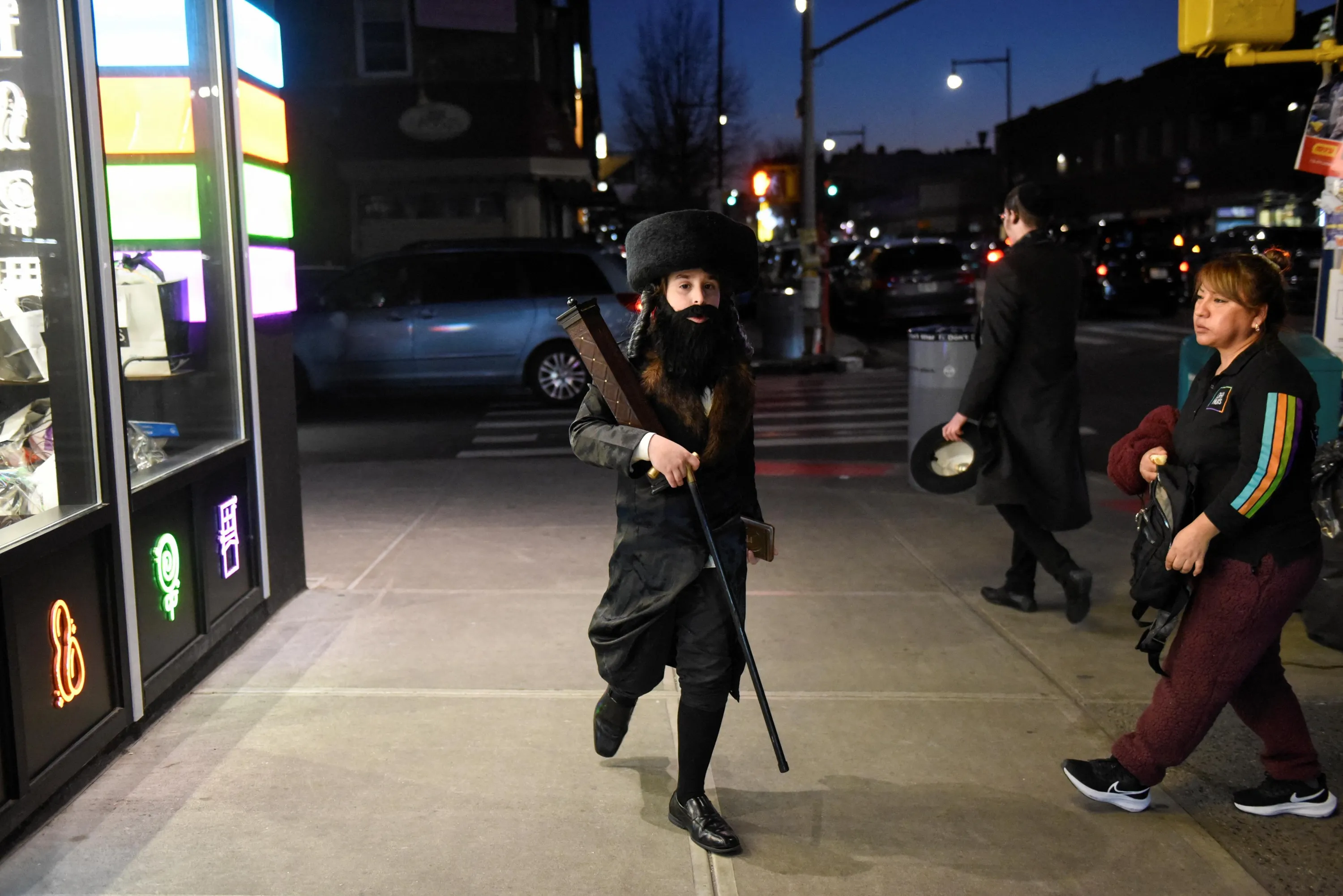 A child wearing a costume walks on the sidewalk during celebrations to mark the Jewish holiday of Purim in the Brooklyn borough of New York City, U.S., March 6, 2023. (Photo by Stephanie Keith/Reuters)