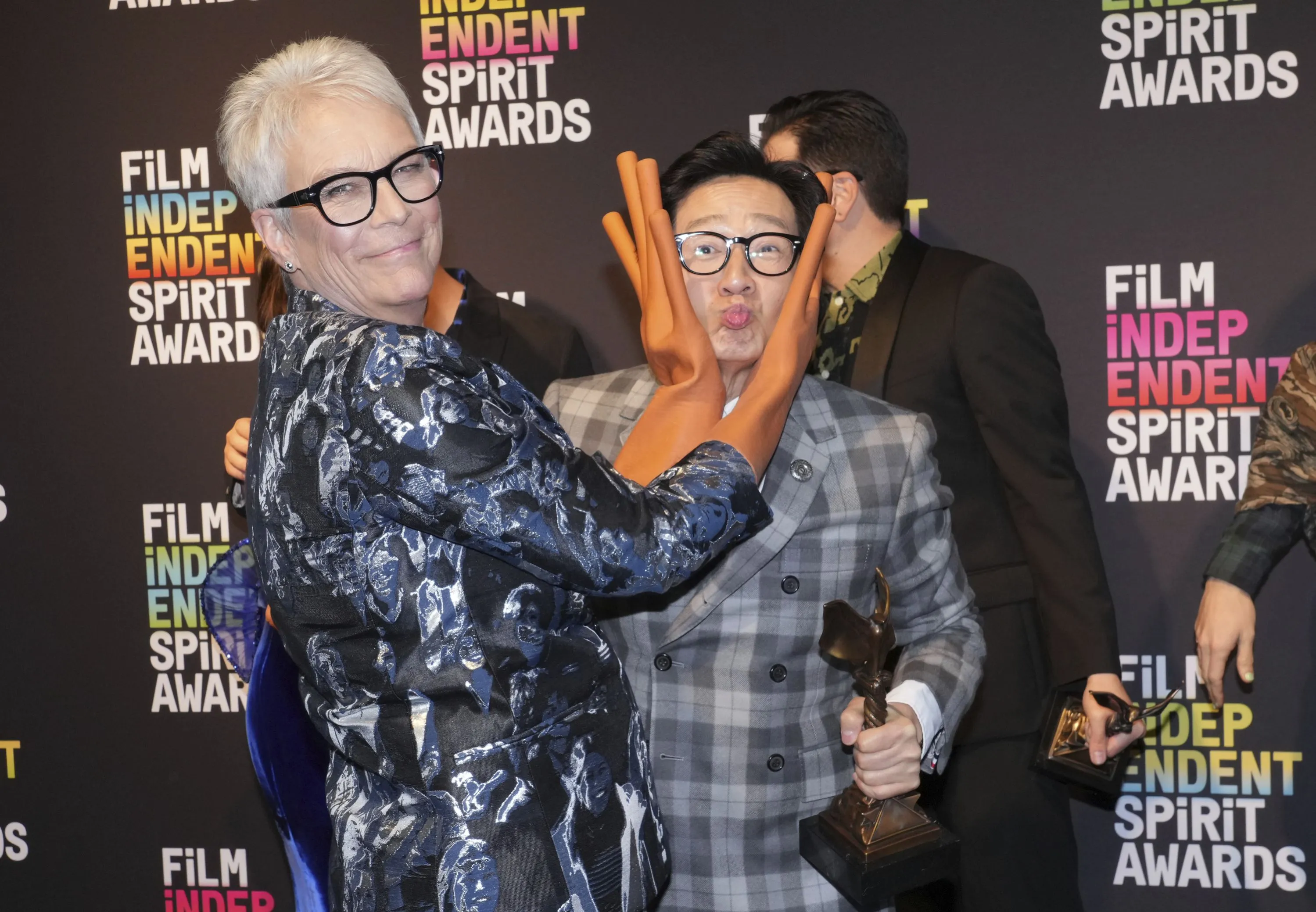 American actress Jamie Lee Curtis, left, wearing hot dog fingers based on a prop from the film “Everything Everywhere All at Once”, poses in the press room with Vietnamese-American actor Ke Huy Quan at the Film Independent Spirit Awards on Saturday, March 4, 2023, in Santa Monica, Calif. The cast and crew won the award for best feature for “Everything Everywhere All at Once”. (Photo by Jordan Strauss/Invision/AP Photo)