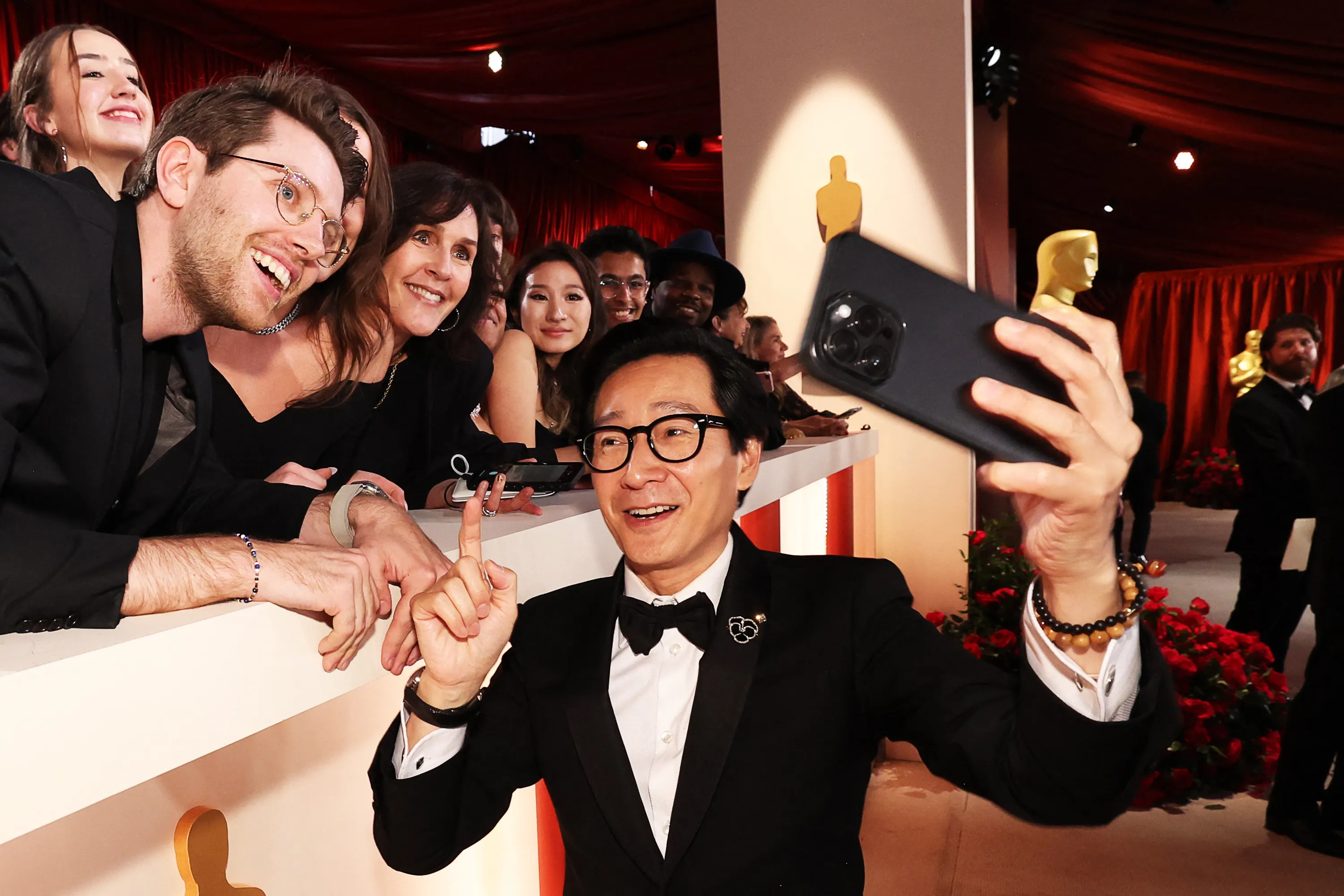 American actor Ke Huy Quan poses for a selfie on the champagne-colored red carpet during the Oscars arrivals at the 95th Academy Awards in Hollywood, Los Angeles, California, U.S., March 12, 202. (Photo by Mario Anzuoni/Reuters)