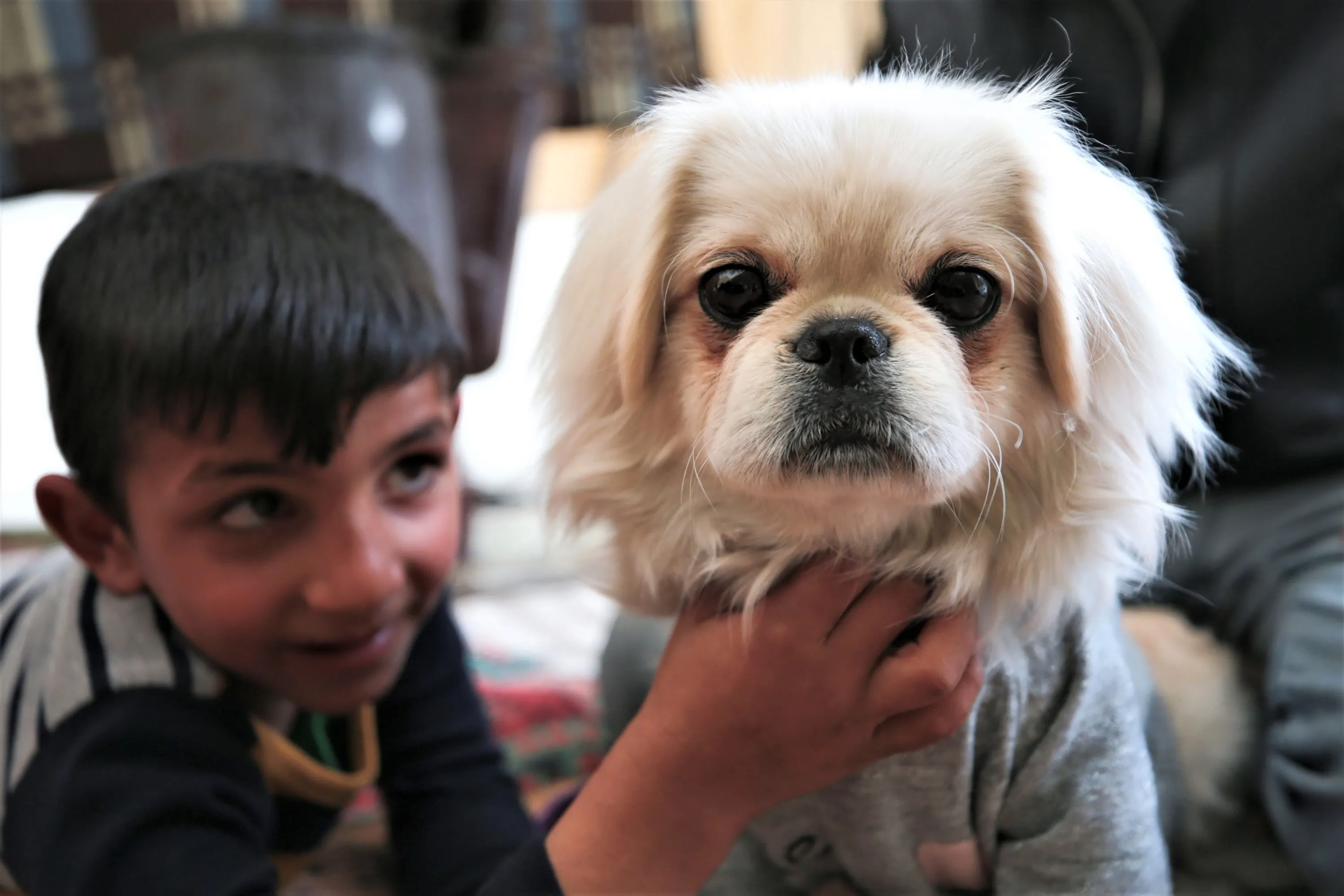 A child pets a dog called “Bincir”, adopted after rescuing under the rubble by Umut Yamuktu, at the tent following 7.7 and 7.6 magnitude earthquakes hit multiple provinces of Turkiye including Adiyaman on February 27, 2023. (Photo by Orhan Cicek/Anadolu Agency via Getty Images)