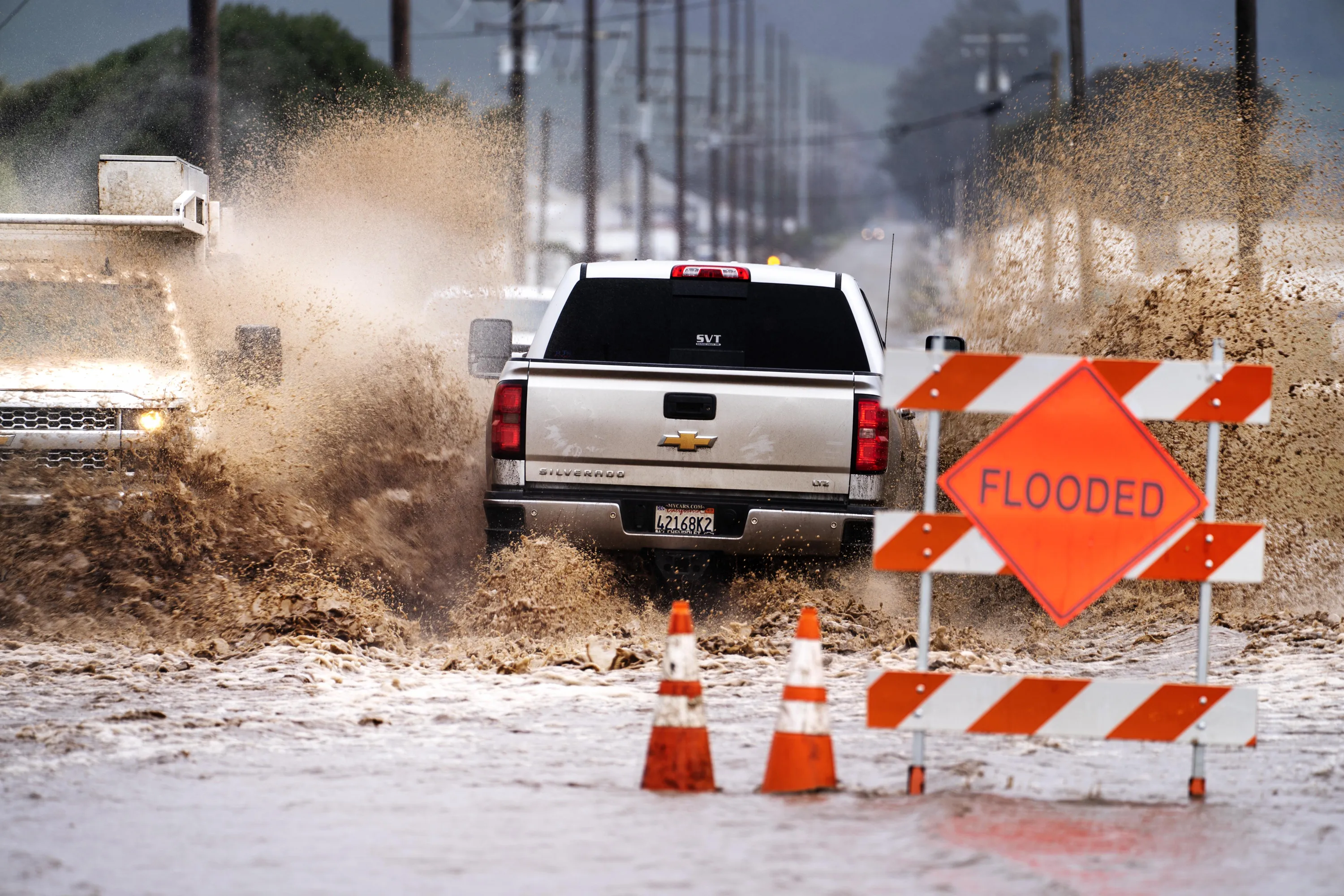 Cars and trucks drive through flooded streets as an atmospheric river storm slams California in Salinas, California on Friday March 10, 2023. (Melina Mara/The Washington Post)