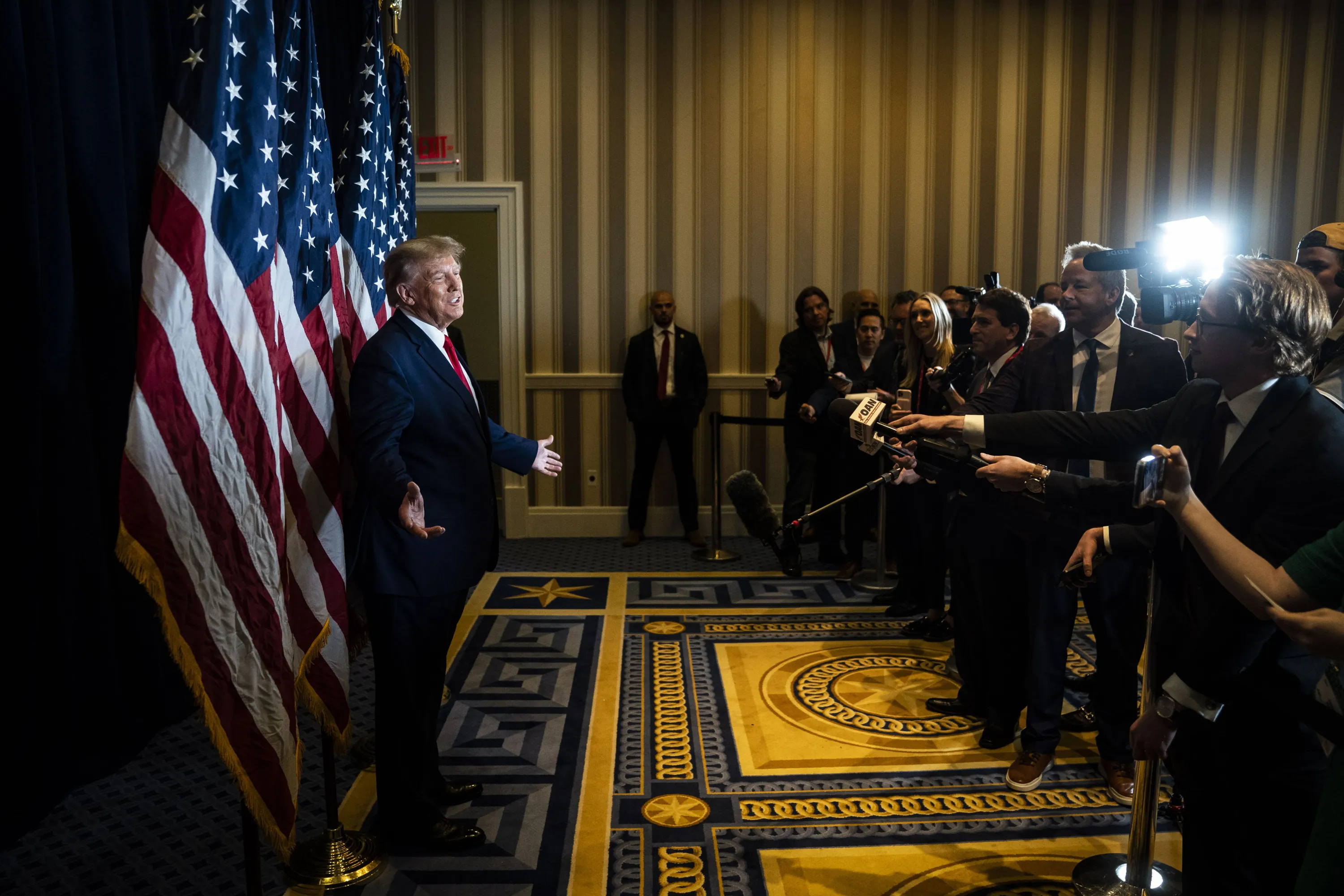 Fort Washington, MD - March 4 : Former President Donald J. Trump speaks to a select group of media during a press conference before speaking on the third and final day of the Conservative Political Action Conference CPAC held at the Gaylord National Resort & Convention Center on Saturday, March 04, 2023, in Fort Washington, MD. (Photo by Jabin Botsford/The Washington Post)