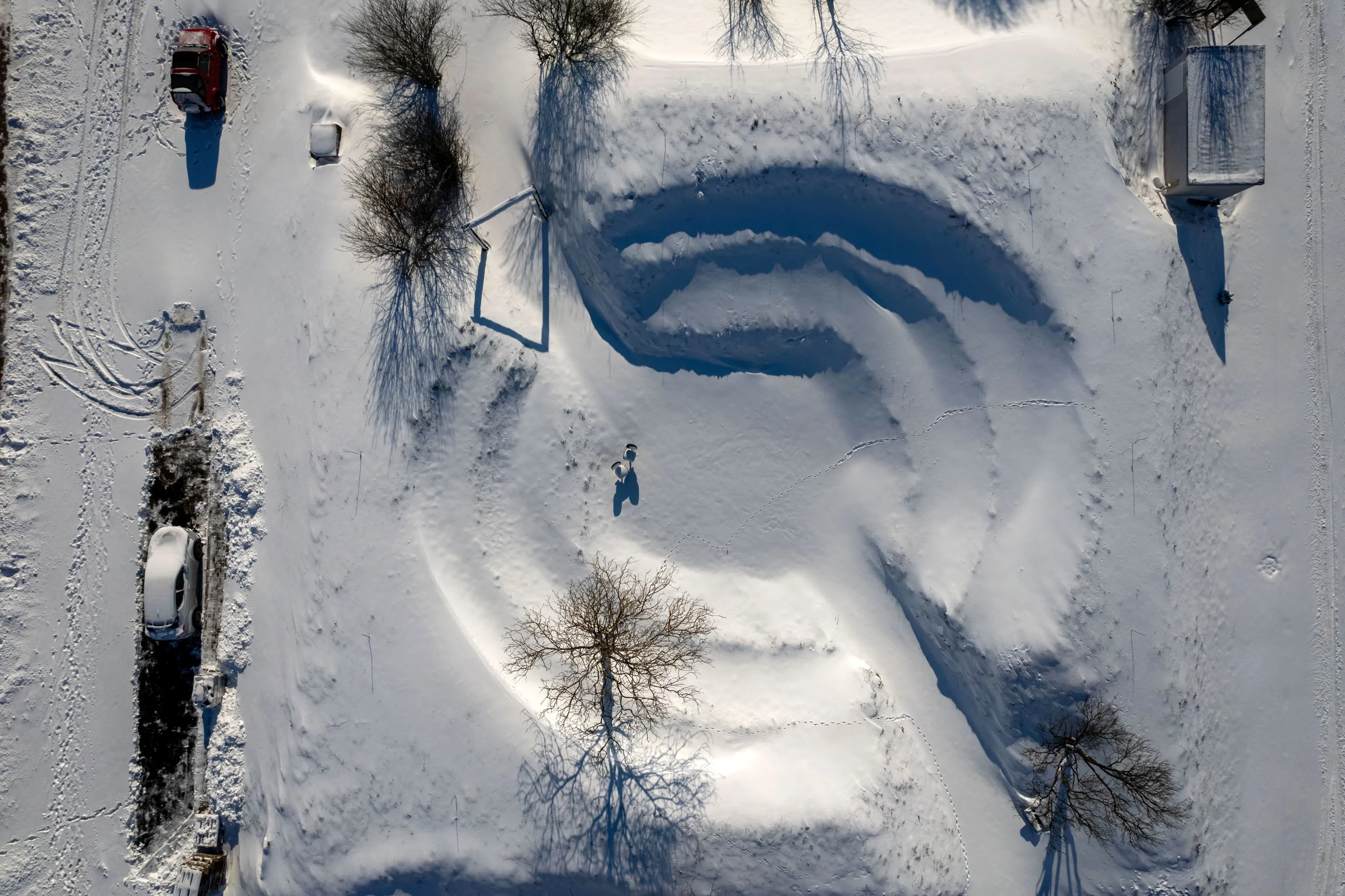 A picture taken with a drone shows a blanket of snow covers an amphitheatre-like open air community structure in Aiton, Transylvania, Romania, 05 February 2023. (Photo by Gabor Kiss/EPA/EFE)
