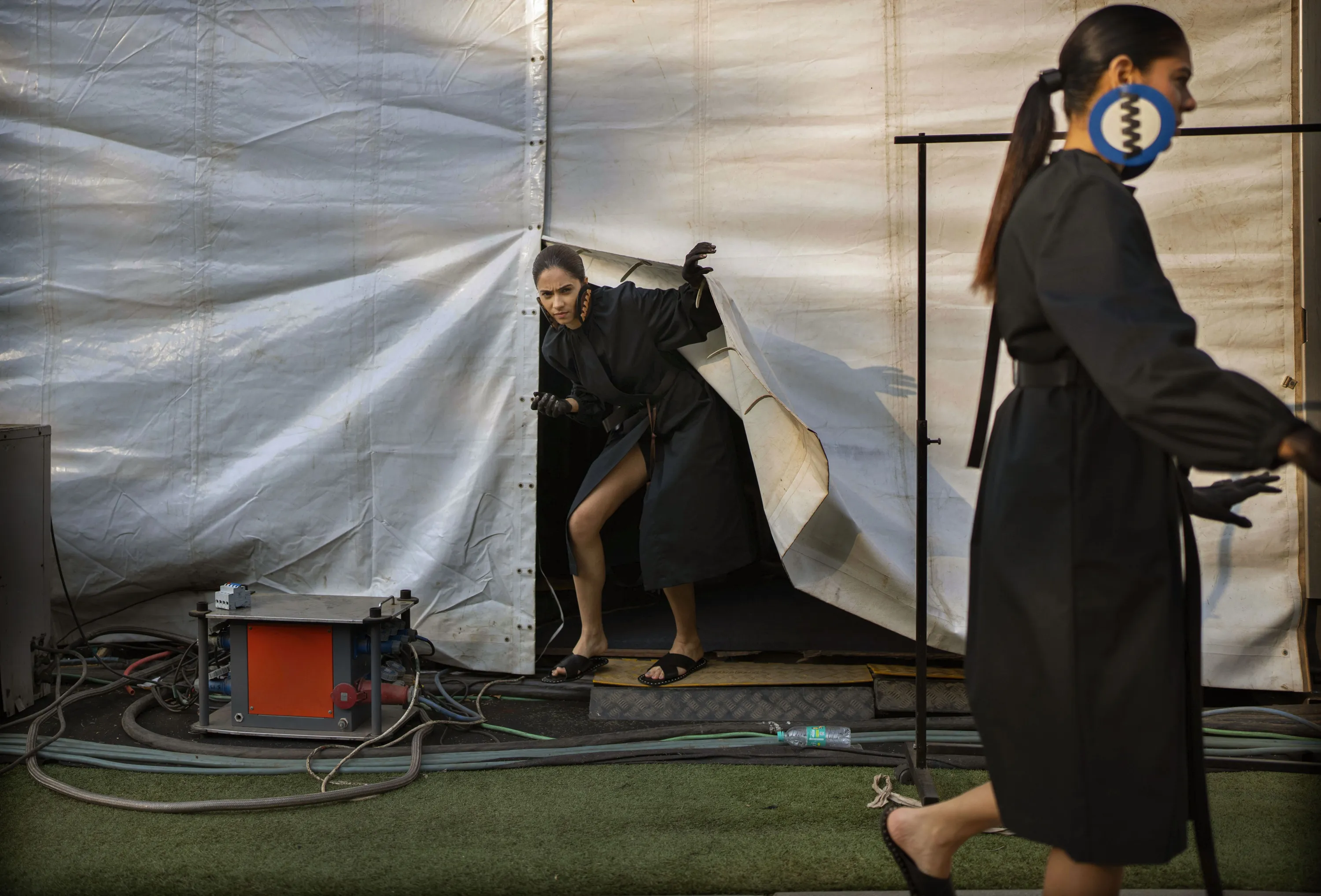 Models leave after a show during the Lakme Fashion Week X FDCI in Mumbai, India, Thursday, March 9, 2023. (Photo by Rafiq Maqbool/AP Photo)