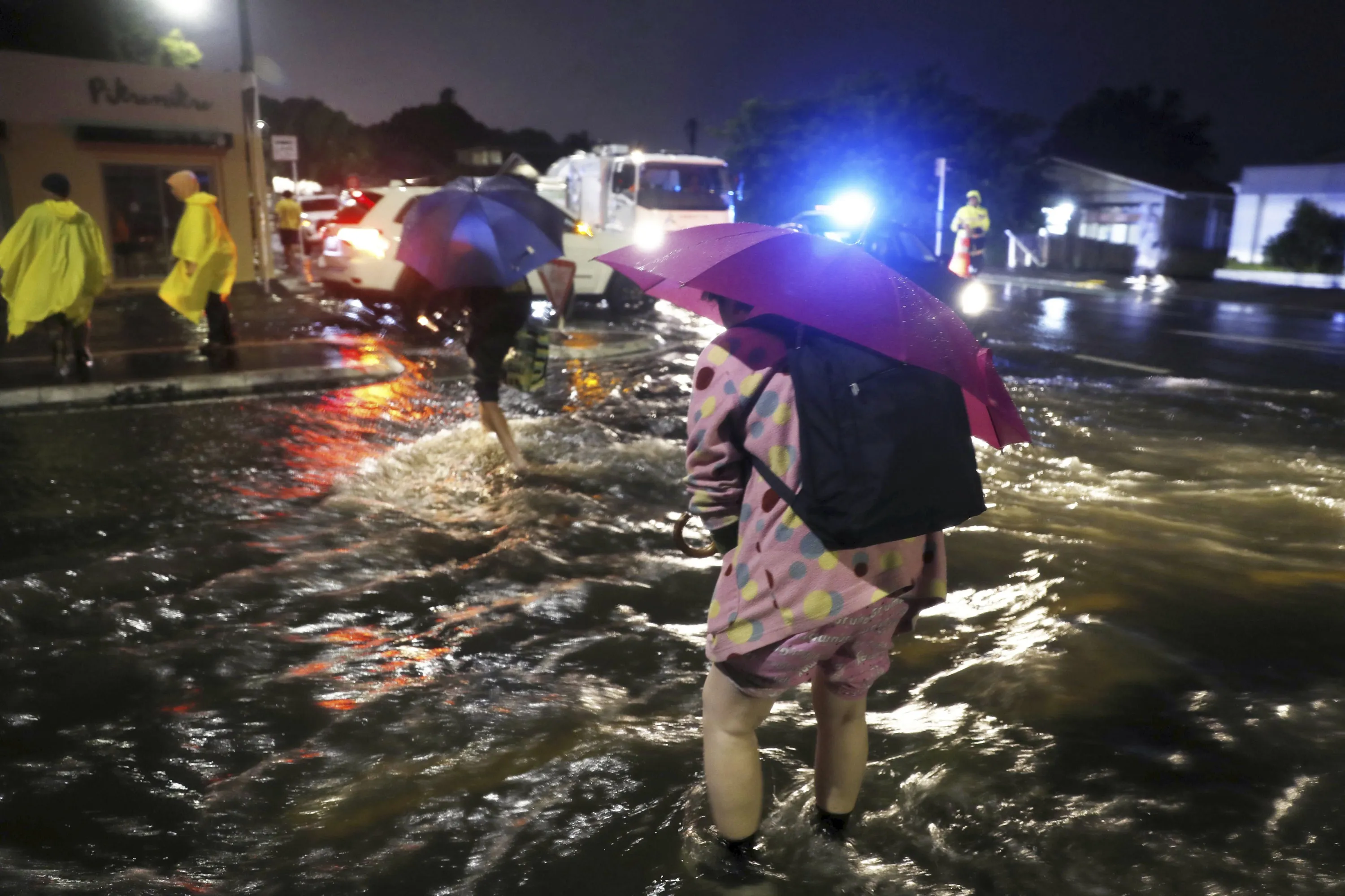 People cross a flooded street in Auckland, Friday, January 27, 2023. Record levels of rainfall pounded New Zealand's largest city, causing widespread disruption. (Photo by Dean Purcell/New Zealand Herald via AP Photo)