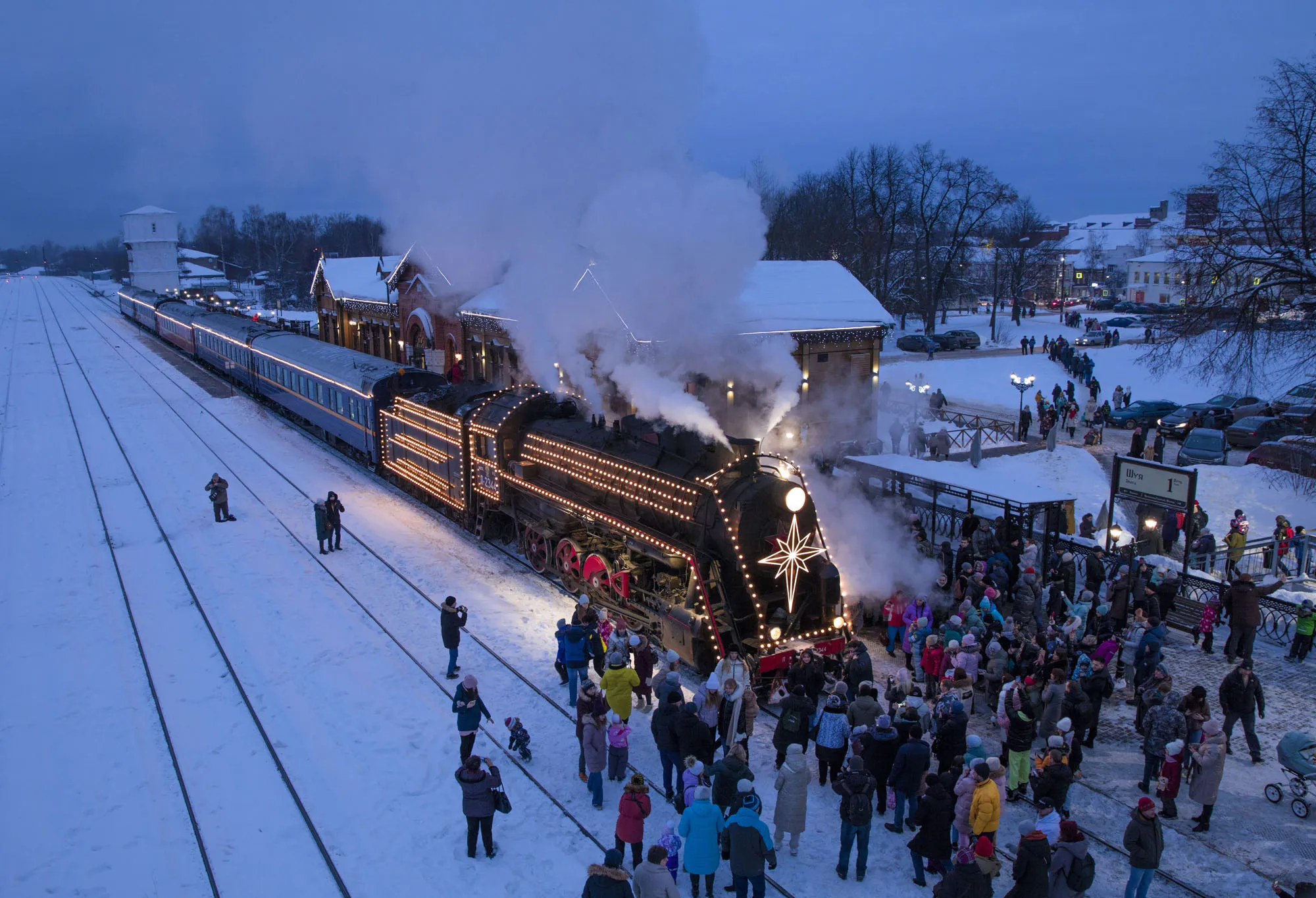 The Christmas retro train passing through the picturesque forests of the Ivanovo region arrives at the station in Shuya town of Ivanovo Oblast, Russia on January 06, 2022. One of the symbols of the Russian Christmas festival is the Christmas retro train. All seats on the train are occupied, tickets were sold out long before the holiday. There are many who want to find themselves in the Christmas fairy tale. The retro train was headed by the steam locomotive P36-0147, built by the Kolomensky Zavod in 1955 and operating until the end of the 1970s. (Photo by Natalia Zakharova/Anadolu Agency via Getty Images)