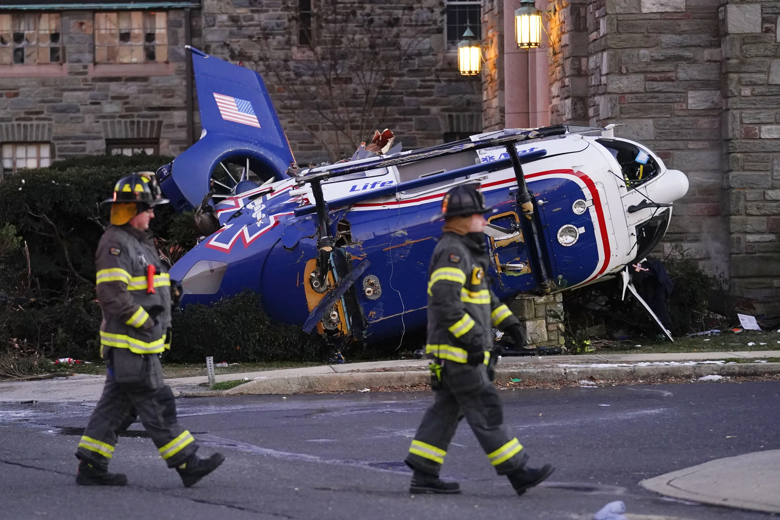 A medical helicopter rests next to the Drexel Hill United Methodist Church after it crashed in the Drexel Hill section of Upper Darby, Pa., on Tuesday, January 11, 2022. Authorities and a witness say a pilot crash landed a medical helicopter without casualties in a residential area of suburban Philadelphia, miraculously avoiding a web of power lines and buildings as the aircraft fluttered, hit the street and slid into bushes outside a church. (Photo by Matt Rourke/AP Photo)