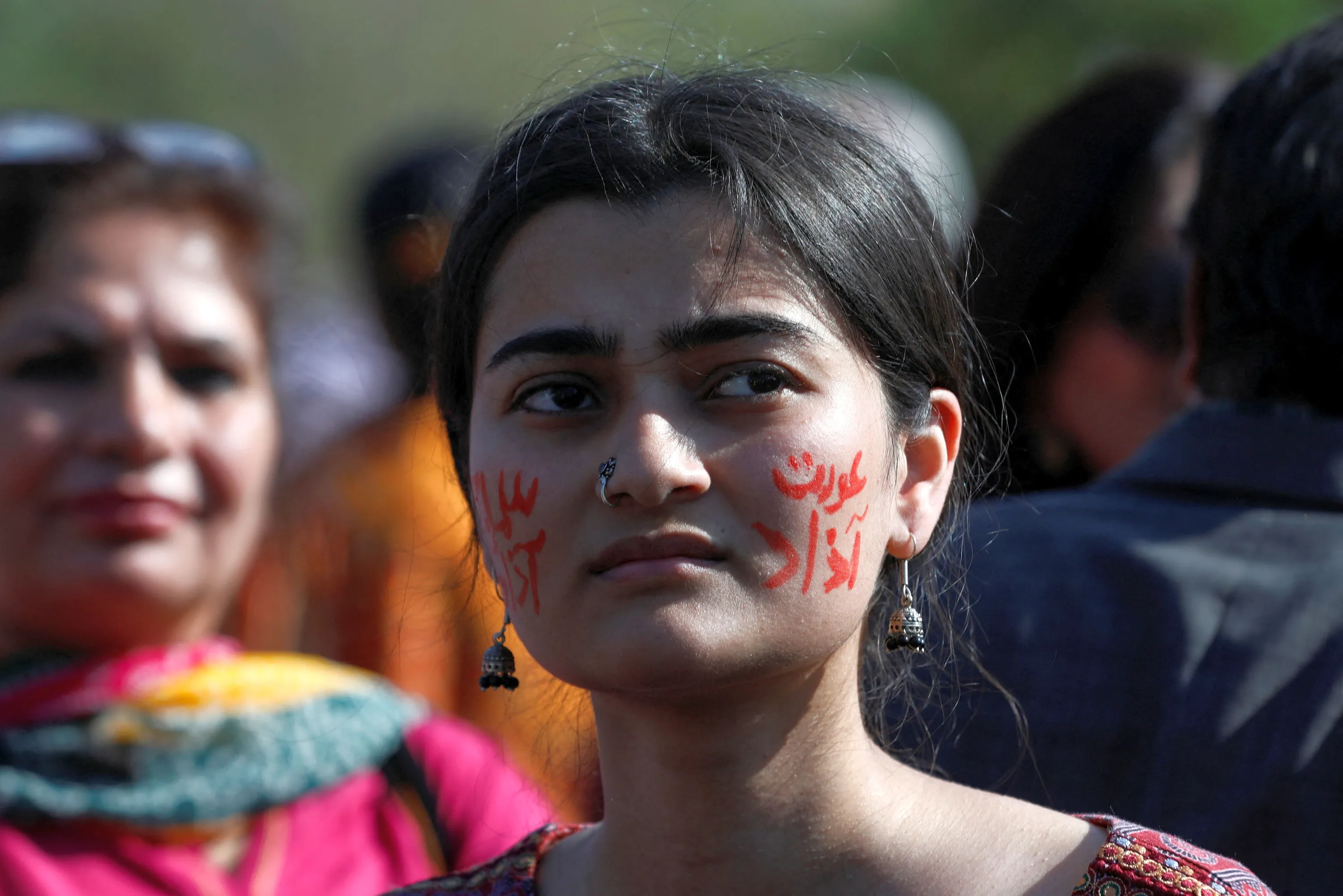 A woman, who has the words “Woman's Freedom” and “Social Freedom” painted on her cheeks, along with others, participate in "Aurat March" or “Women's March”, to mark International Women's Day, in Islamabad, Pakistan on March 8, 2023. (Photo by Akhtar Soomro/Reuters)