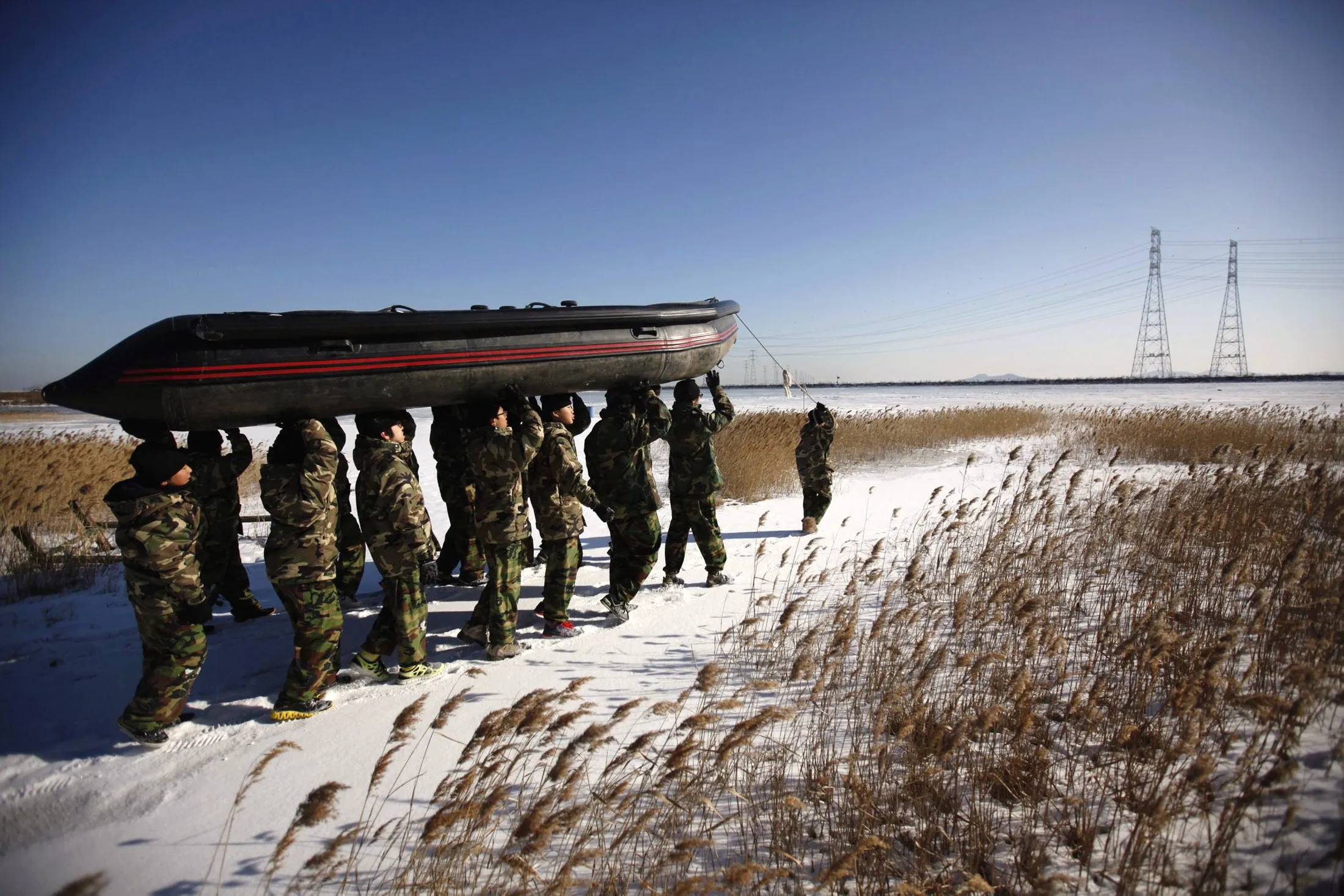 Students carry an inflatable boat during a winter military camp in Ansan, south of Seoul January 3, 2013. Hundreds of students between 11 and 17 years old attend winter boot camp training courses every year. The winter courses range from 4 to 14 days at the Blue Dragon Camp run by retired marines, which also offers summer boot camp for students. REUTERS/Kim Hong-Ji (SOUTH KOREA - Tags: EDUCATION SOCIETY MILITARY)