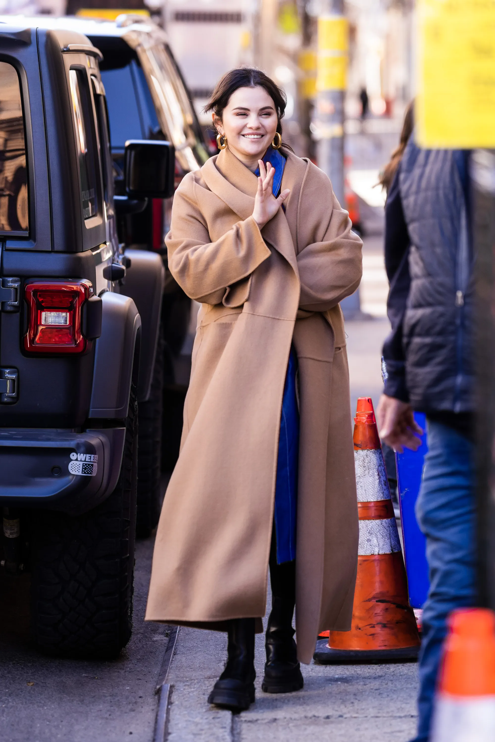 Selena Gomez is seen leaving the Only Murders in the Building set at the United Palace Theater in New York City on March 9, 2023. The pop star and actress wore a brown trench coat, with black boots. (Photo by The Image Direct)