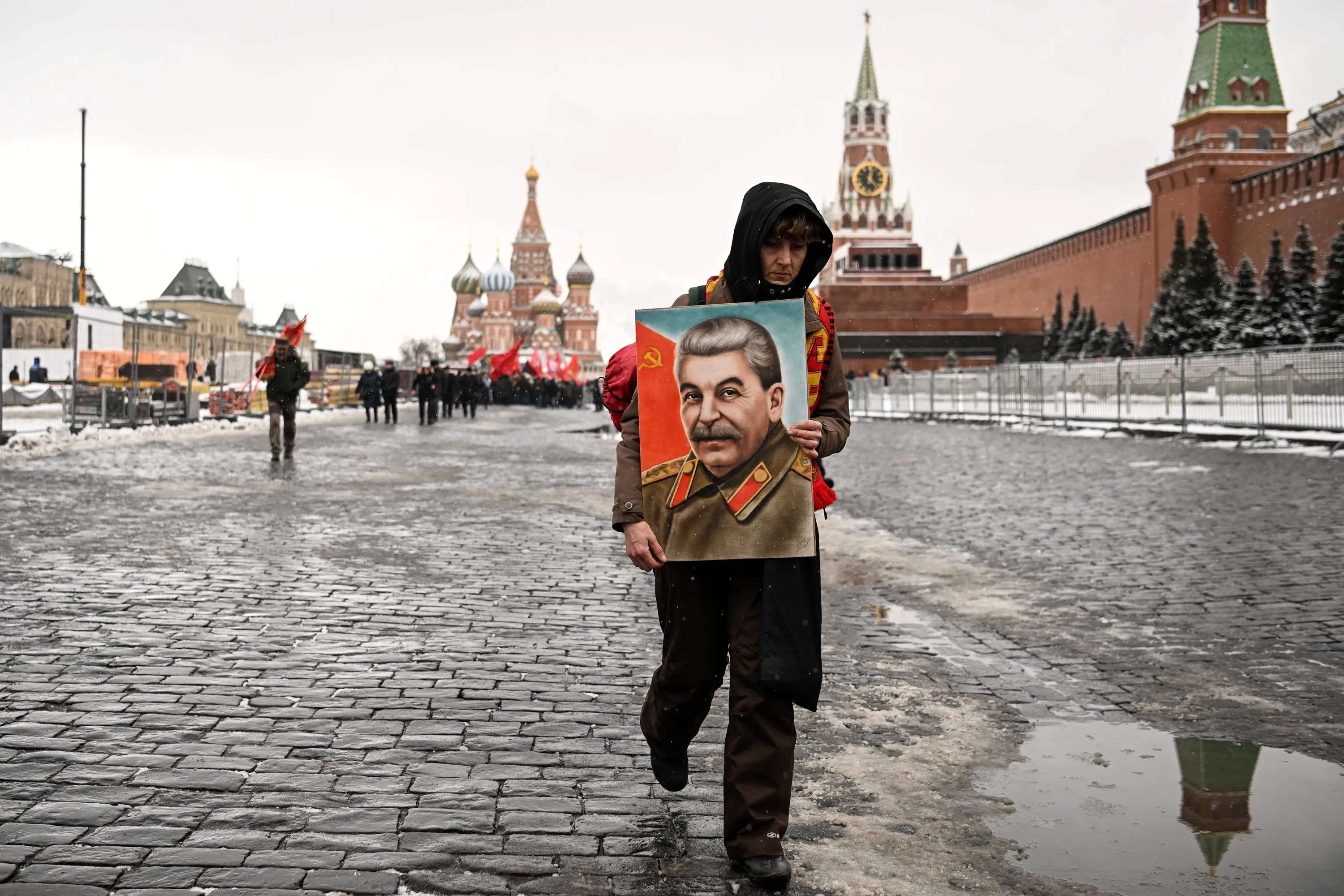 Russian Communist party supporter holds a portrait of late Soviet leader Joseph Stalin as she leaves a memorial ceremony to mark the 70th anniversary of his death at Red Square in Moscow on March 5, 2023. (Photo by Kirill Kudryavtsev/AFP Photo)