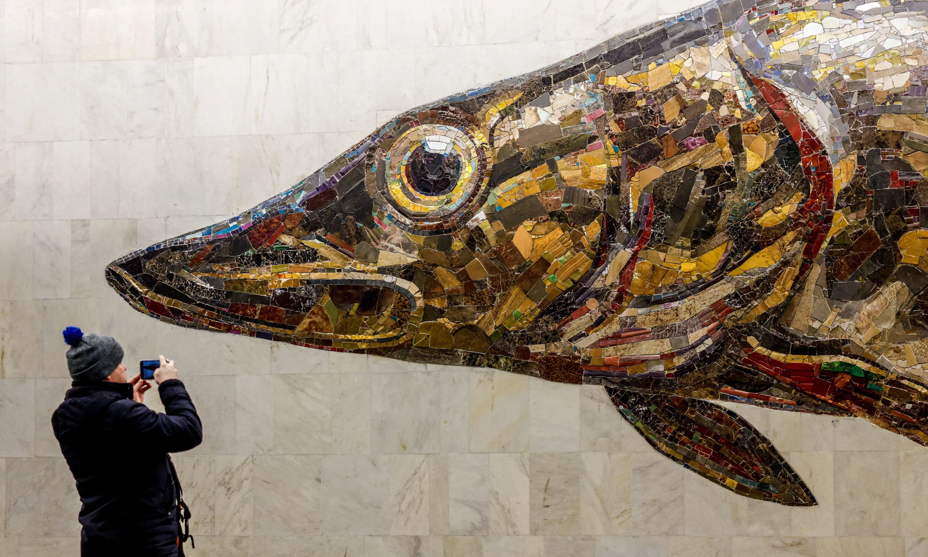 A man takes a picture of a mosaic image of a pike fish at Nagatinsky Zaton station of the newly opened Big Circle Line of the subway in Moscow, Russia on March 6, 2023. (Photo by Maxim Shemetov/Reuters)