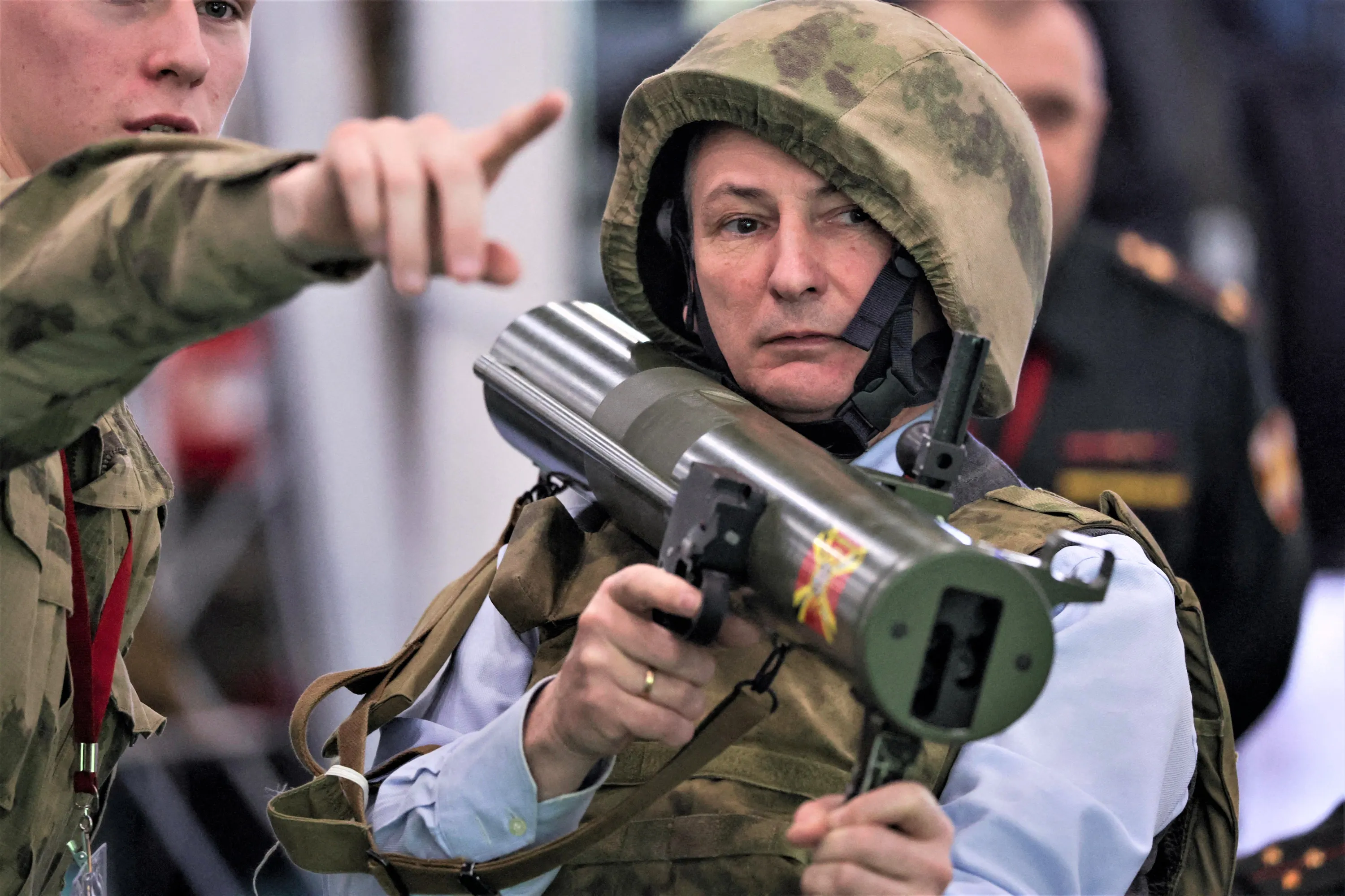 A visitor levels a simulator of an infantry rocket flamethrower at “ExpoTechnoStrazh” exhibition of advanced technologies and equipment securing safety and security, which is an event organized by local authorities and Russia's Federal National Guard Service or Rosgvardiya, in Saint Petersburg, Russia on March 15, 2023. (Photo by Anton Vaganov/Reuters)