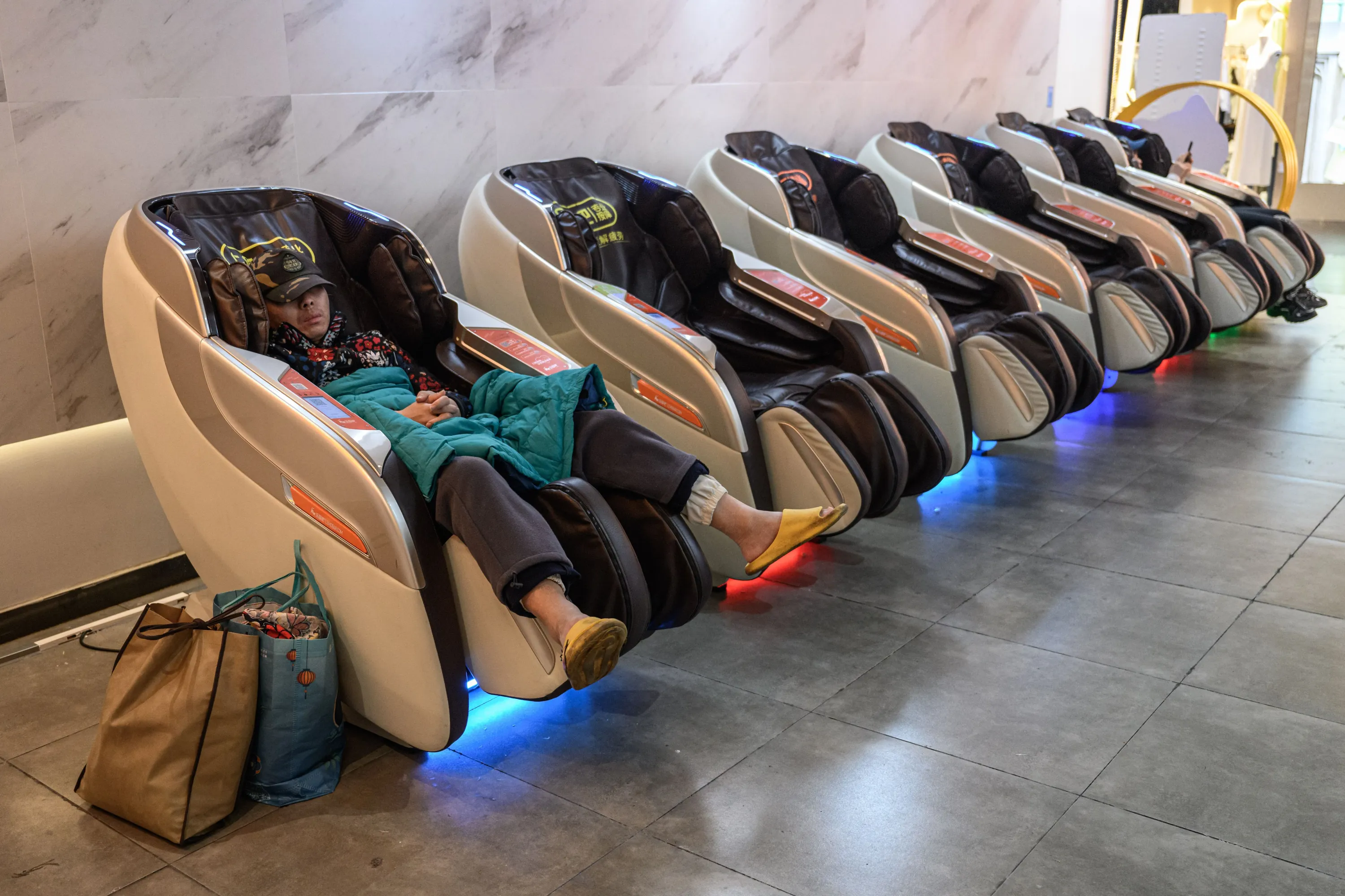 A man rests in a mall during the World Sleep Day on March 17, 2023 in Guangzhou, Guangdong Province of China. (Photo by John Ricky/Anadolu Agency via Getty Images)
