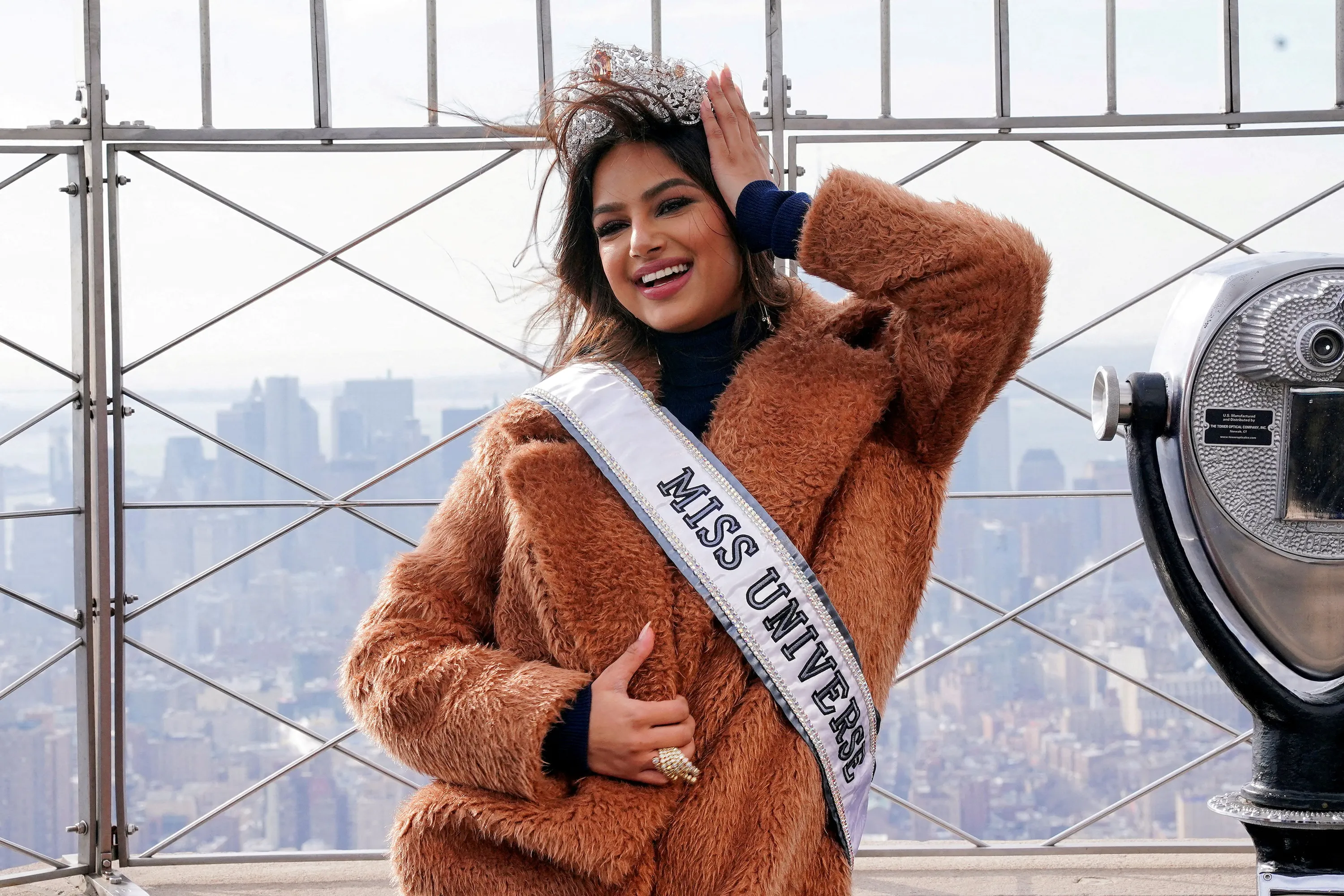 Miss Universe 2021 Harnaaz Sandhu from India poses for photos in the wind, on the observation level of the Empire State Building, in the Manhattan borough of New York City, New York, U.S., January 12, 2022. (Photo by Carlo Allegri/Reuters)