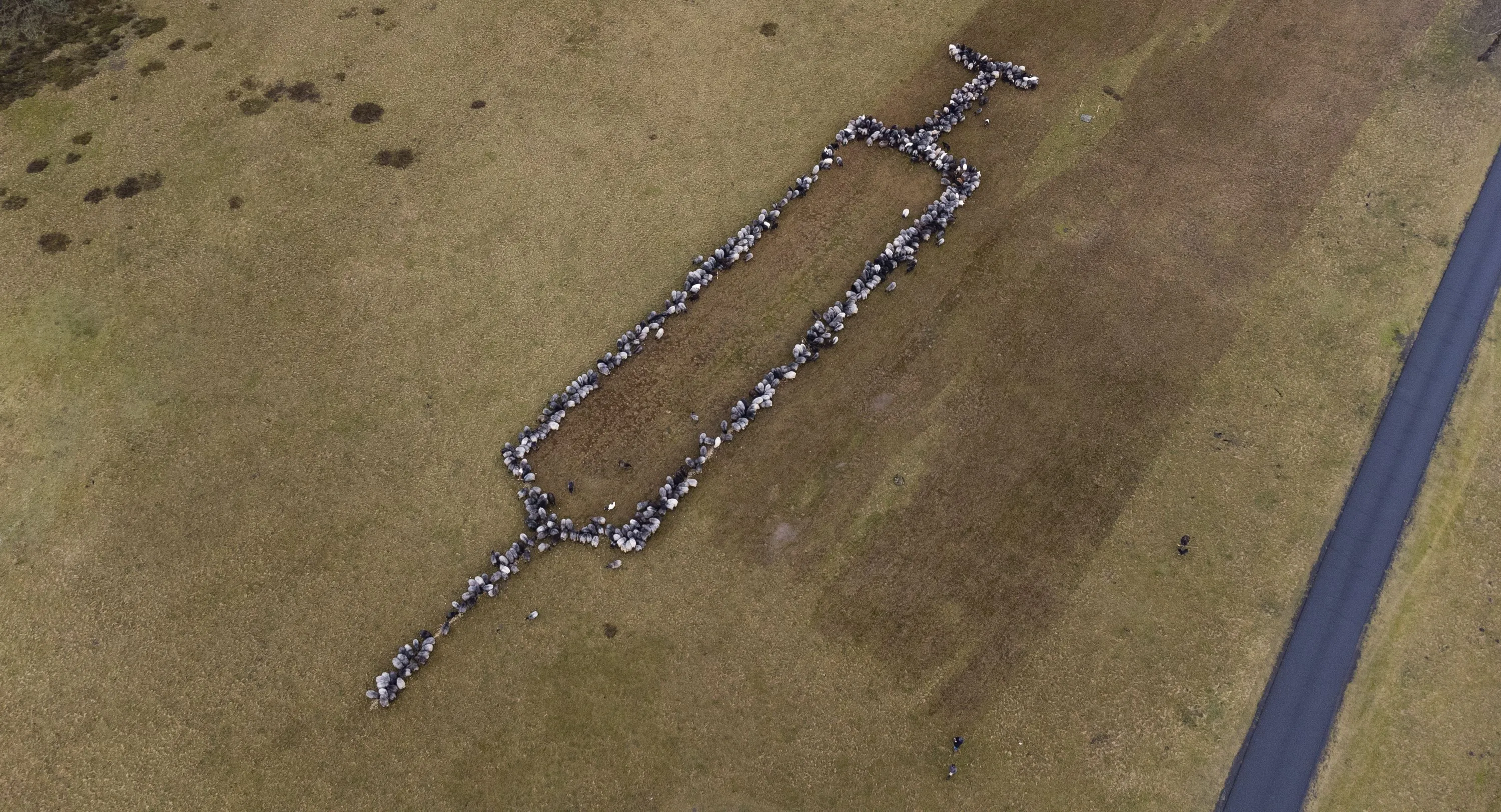 Sheep and goats stand together in Schneverdingen, Germany, as they form an approximately 100 meters large syringe to promote vaccinations against COVID-19, Monday, January 3, 2022. (Photo by Philipp Schulze/dpa via AP)