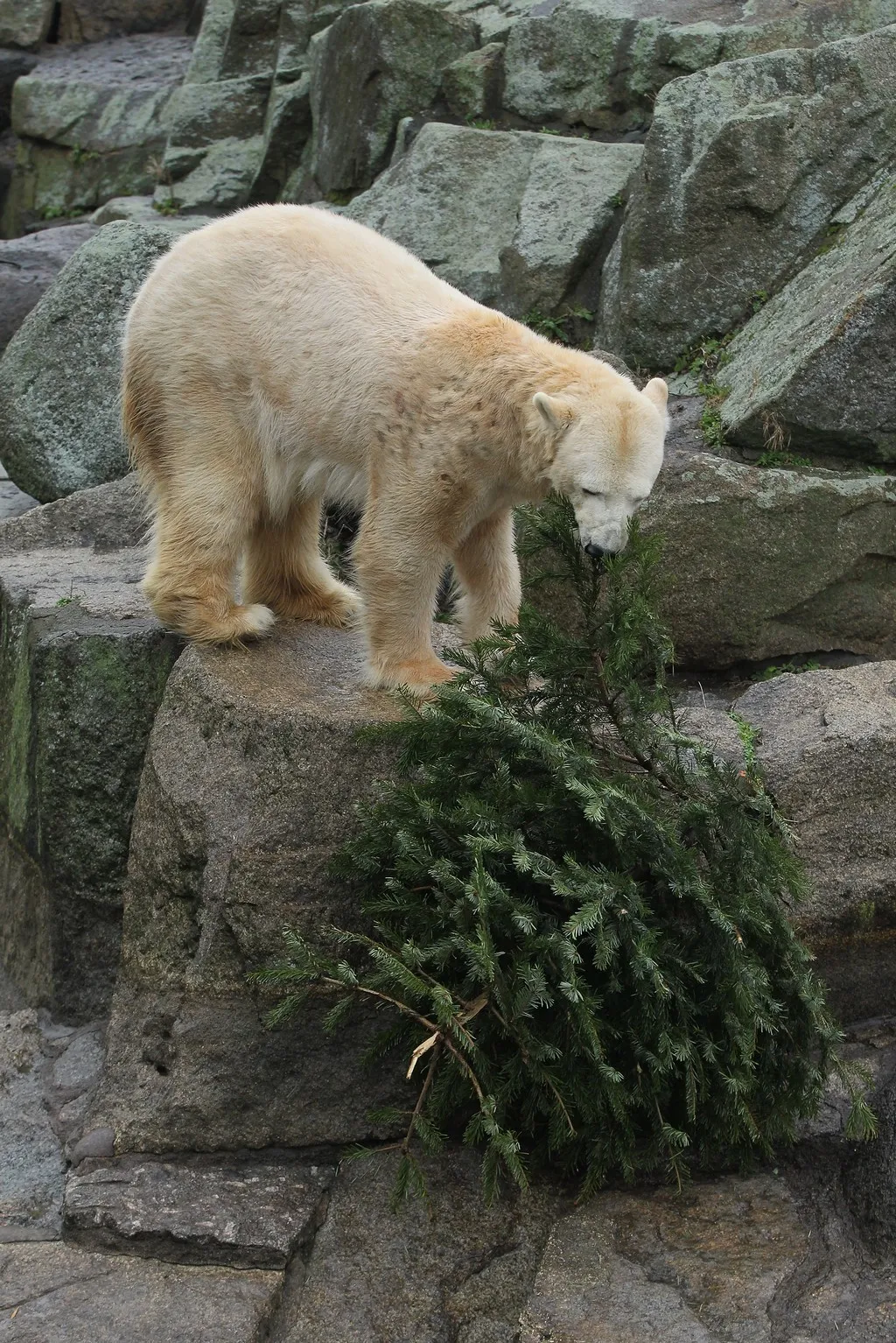 BERLIN, GERMANY - JANUARY 17: Tosca, mother of famed polar bear Knut, pulls on a discarded Christmas tree at her enclosure on the day a plaster sculpture entitled "Knut - The Dreamer," by artist Josef Tabachnyk and which is the winning proposal for the future bronze sculpture of Knut, was unveiled at Zoo Berlin zoo on January 17, 2012 in Berlin, Germany. Knut, who won global fame, died last year from a brain seizure. The final bronze sculpture, scheduled to be unveiled this summer, will be approximately one meter long. (Photo by Sean Gallup/Getty Images)