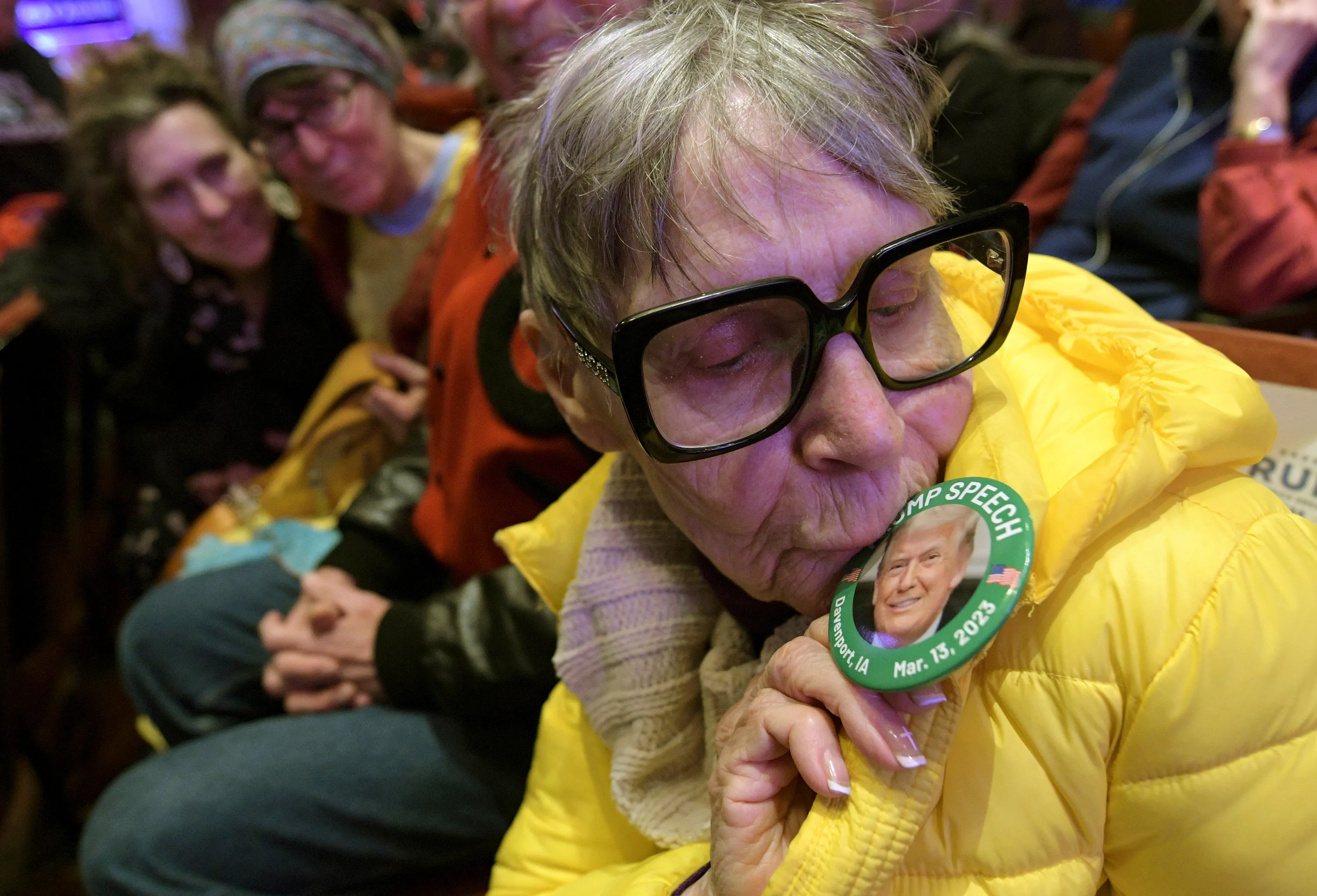 Odelia Rogers, 81, kisses a button with a photo of former President Donald Trump before Trump speaks at a campaign event Monday, March 13, 2023, in Davenport, Iowa. (Photo by Ron Johnson/AP Photo)