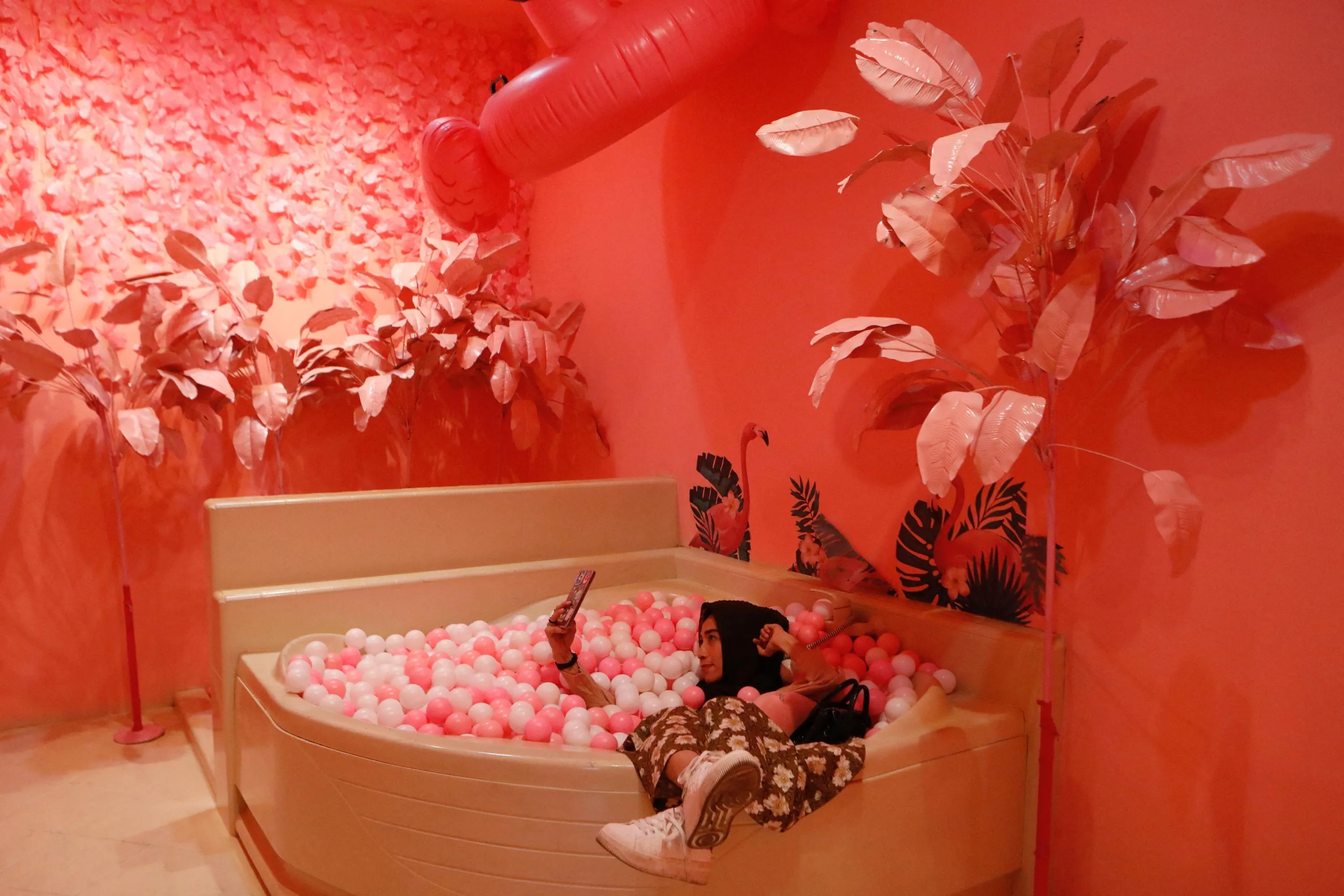A woman takes a selfie at HOLEO Golf & Museum in Jakarta, Indonesia on March 3, 2023. (Photo by Ajeng Dinar Ulfiana/Reuters)