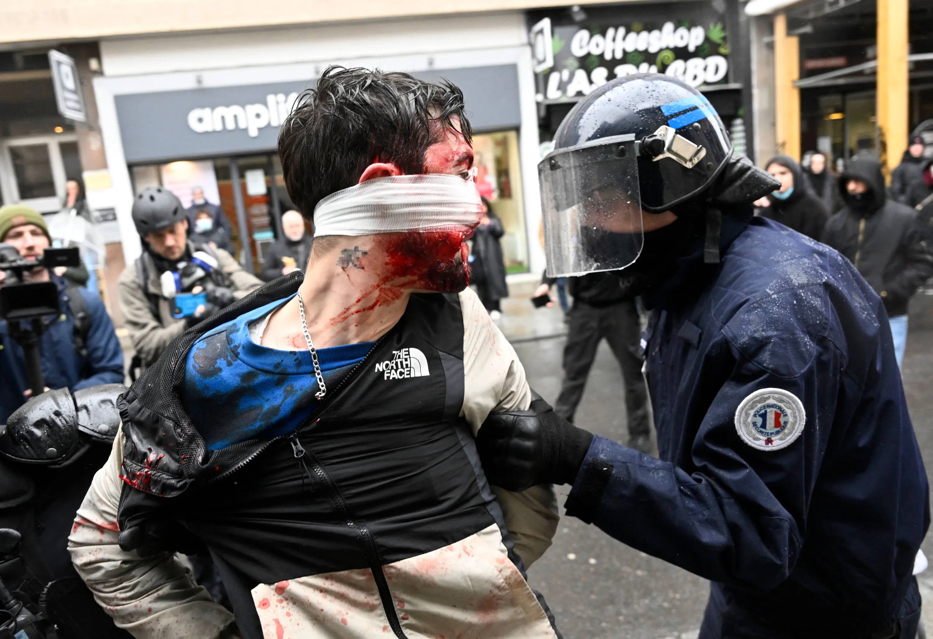 Riot police officers detain a person during a rally organised by fishermen against the “regulations and persecution of the Management of Maritime Affairs (direction des affaires maritimes)”, in Rennes, western France, on March 22, 2023. (Photo by Damien Meyer/AFP Photo)