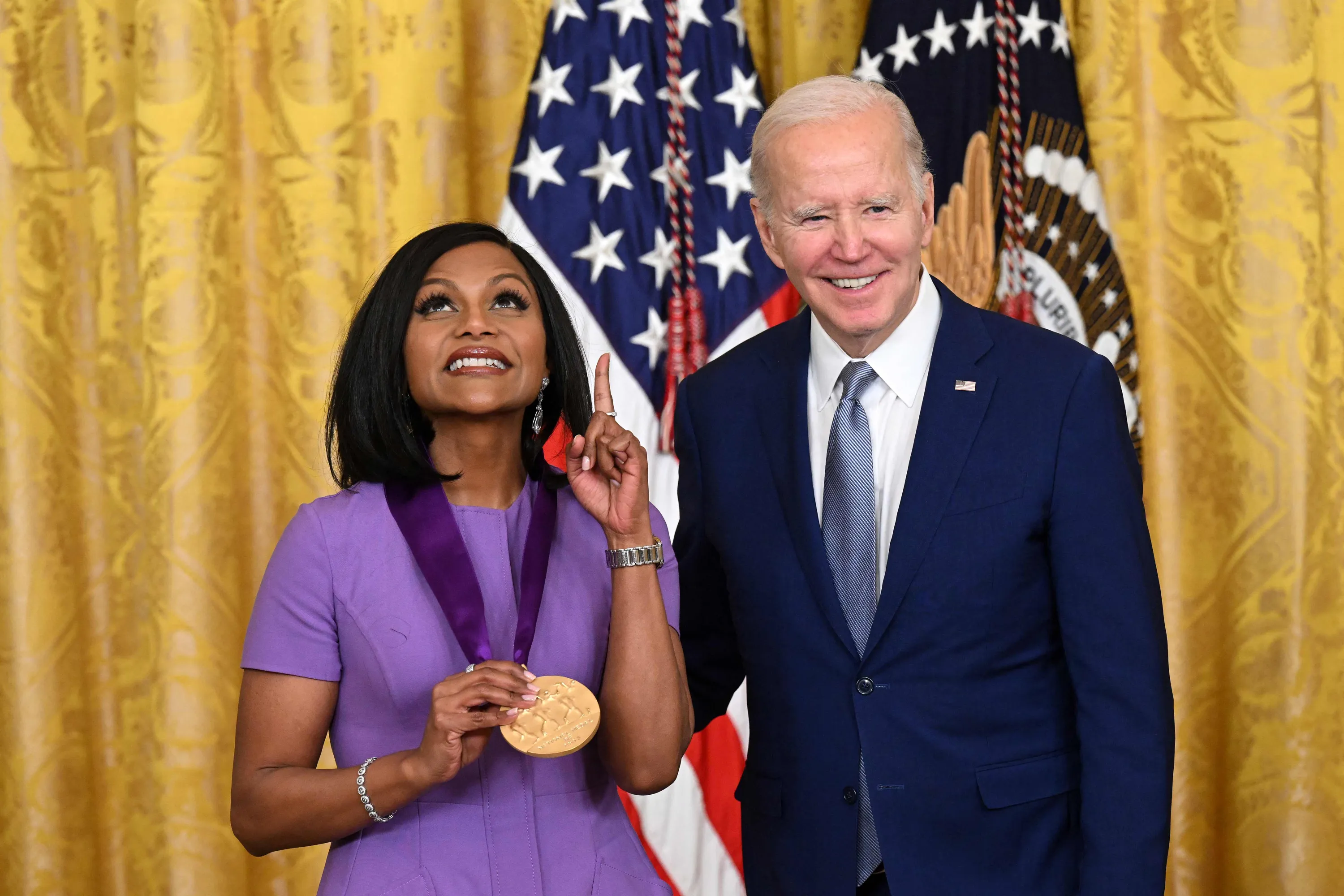 US President Joe Biden awards actress Mindy Kaling with the 2021 National Medal of Arts during a ceremony in the East Room of the White House in Washington, DC, March 21, 2023. (Photo by Saul Loeb/AFP Photo)
