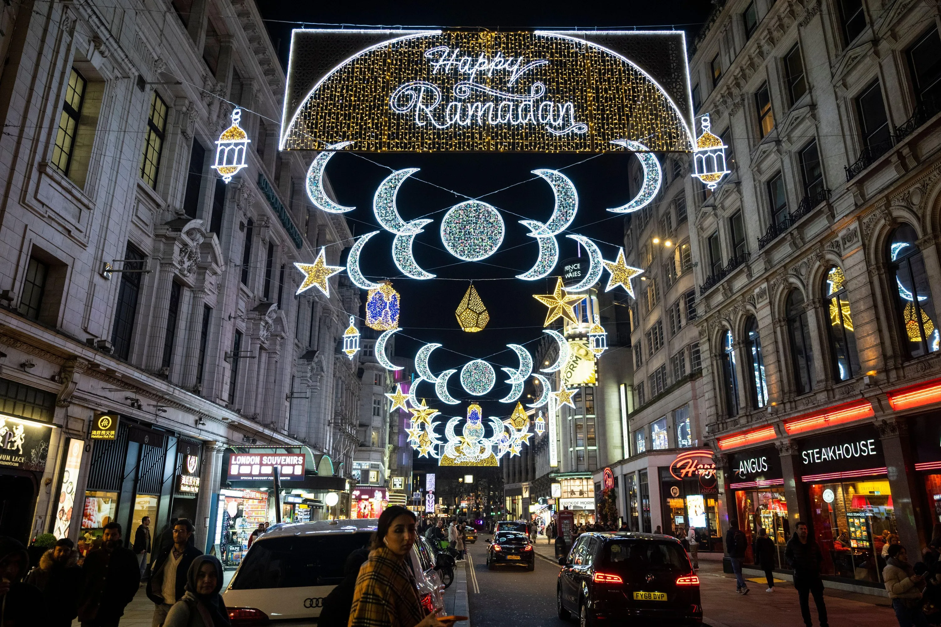 Members of the public view the first ever Ramadan lights installation at Piccadilly Circus in London on March 21, 2023 which were switched on earlier on the eve of the first day of Ramadan 2023. Lights of this scale are a first in the UK and Europe, with 30,000 sustainable lights illuminated in central London for the whole month of Ramadan. (Photo by Stephen Chung/Alamy Live News)