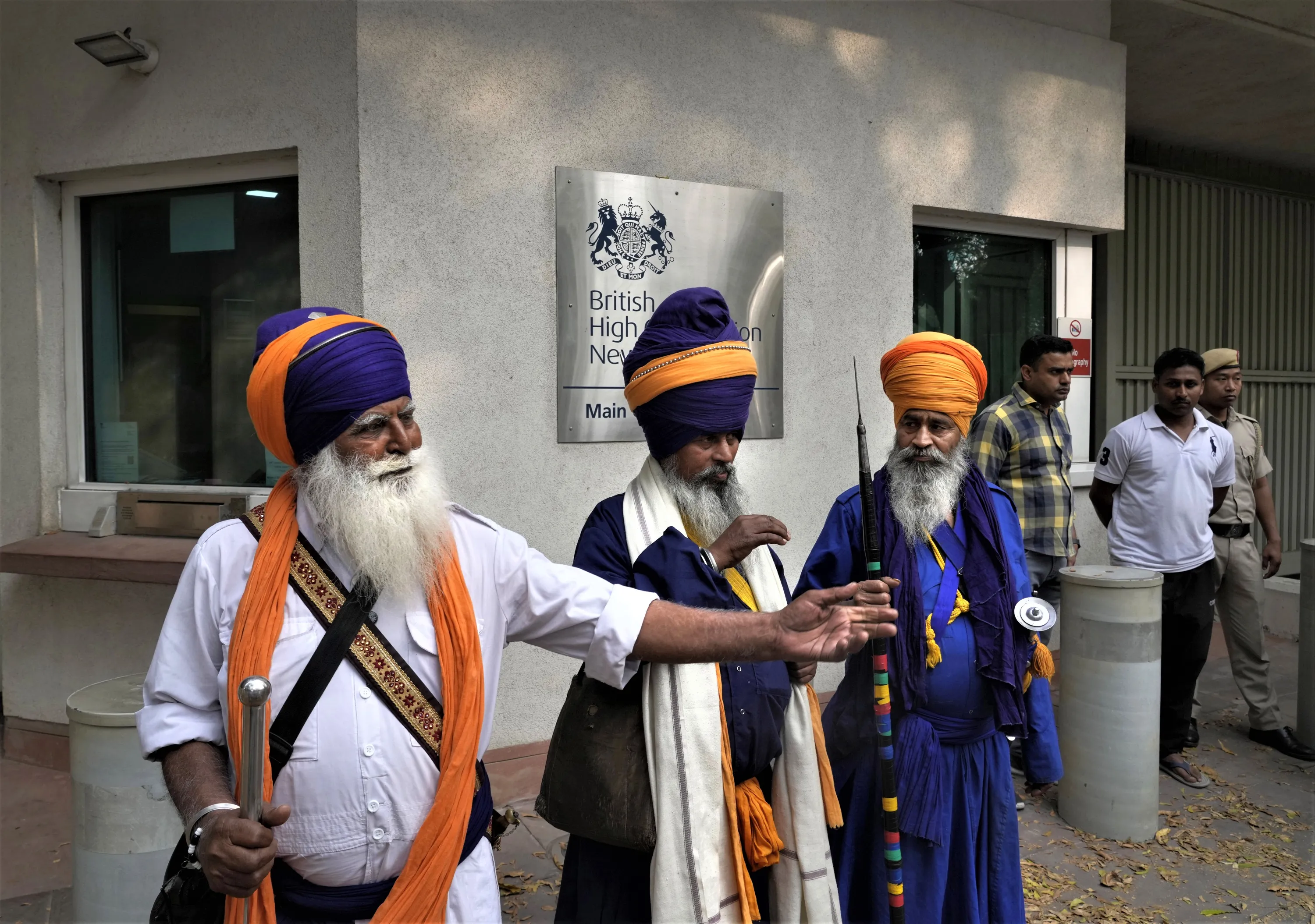 Indian Sikhs protesting against the pulling down of Indian flag from the Indian High Commission building in London gather outside the British High Commission in New Delhi, India, Monday, March 20, 2023. Footage posted on social media showed a man detach the Indian flag from a balcony of the building while a crowd of people below waving bright yellow “Khalistan” banners appeared to encourage him. London’s Metropolitan Police force said a man was arrested on suspicion of violent disorder outside the diplomatic mission on Sunday afternoon. (Photo by Manish Swarup/AP Photo)