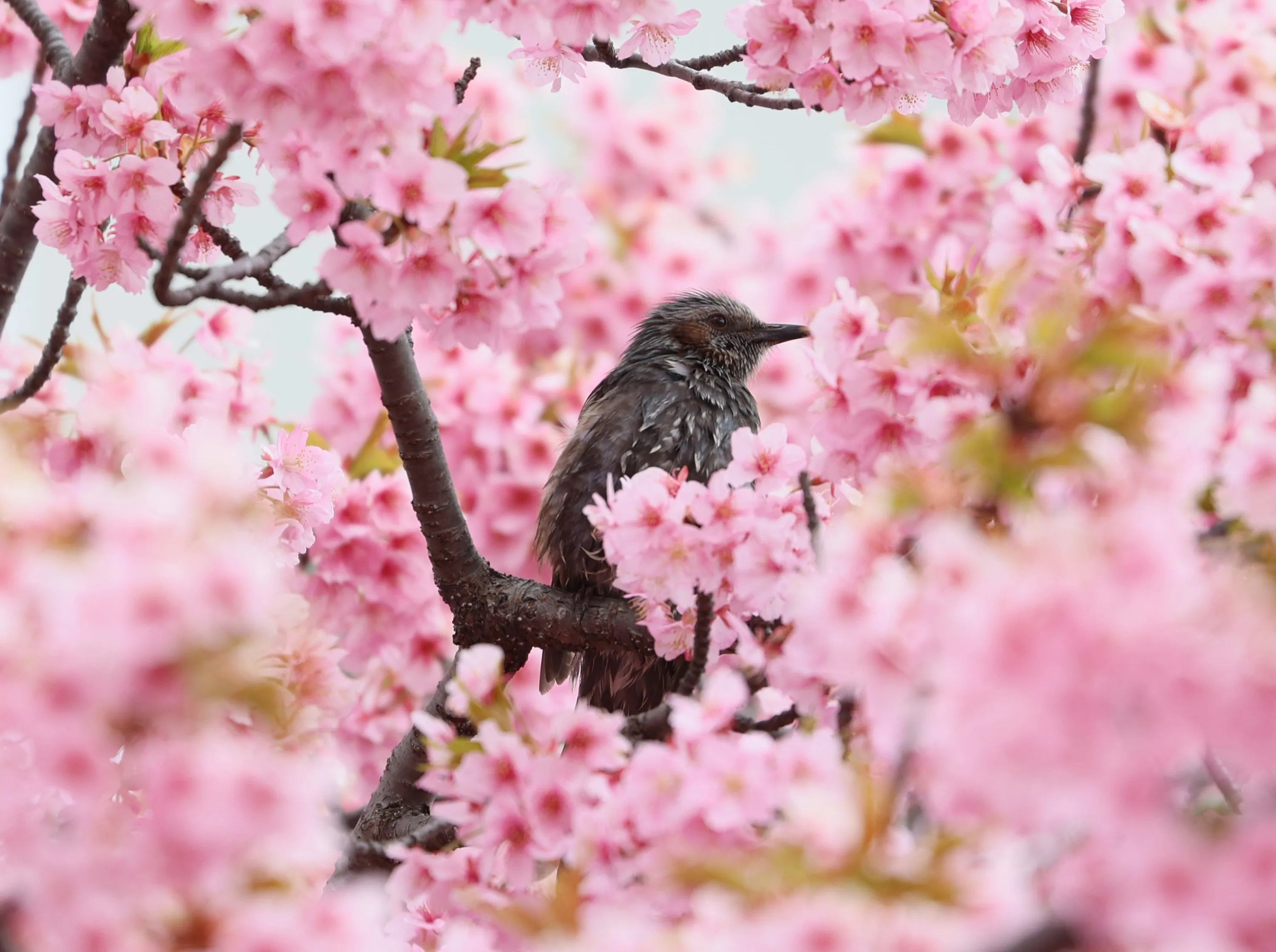 A bird perches on a branch of fully bloomed early flowering cherry blossoms at a river bank in Tokyo on Monday, March 6, 2023. (Photo by Yoshio Tsunoda/AFLO/Rex Features/Shutterstock)