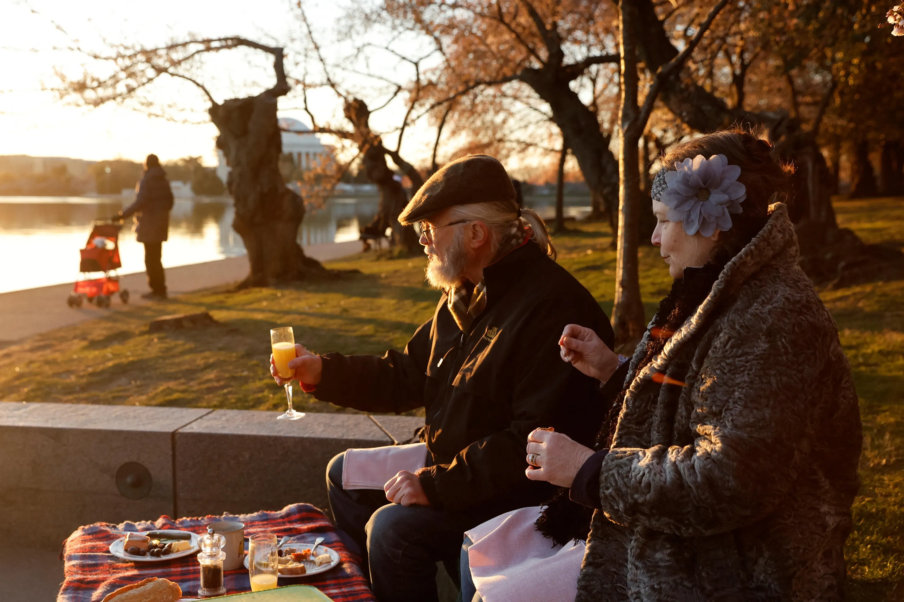 Elizabeth Willson and Garland Phillips greet the sunrise with a picnic breakfast amongst the cherry blossoms, which officials expect to reach their peak in the next few days, along the Tidal Basin in Washington, U.S. March 20, 2023. (Photo by Jonathan Ernst/Reuters)