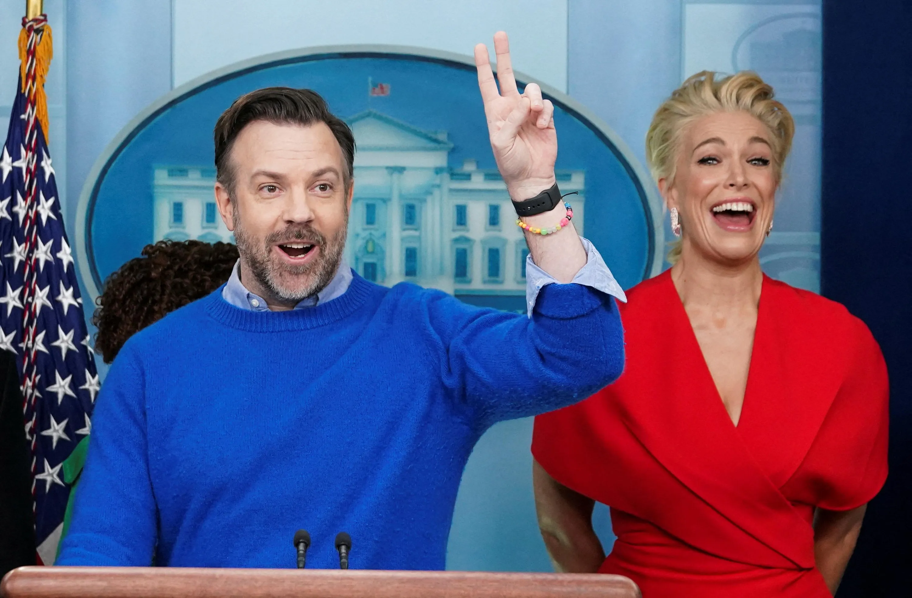 Hannah Waddingham reacts as Jason Sudeikis takes questions while the cast of Ted Lasso joined Press Secretary Karine Jean-Pierre at the daily press briefing to discuss the importance of addressing mental health to promote overall well-being, in the Brady Press Briefing Room at the White House in Washington, U.S., March 20, 2023. (Photo by Kevin Lamarque/Reuters)