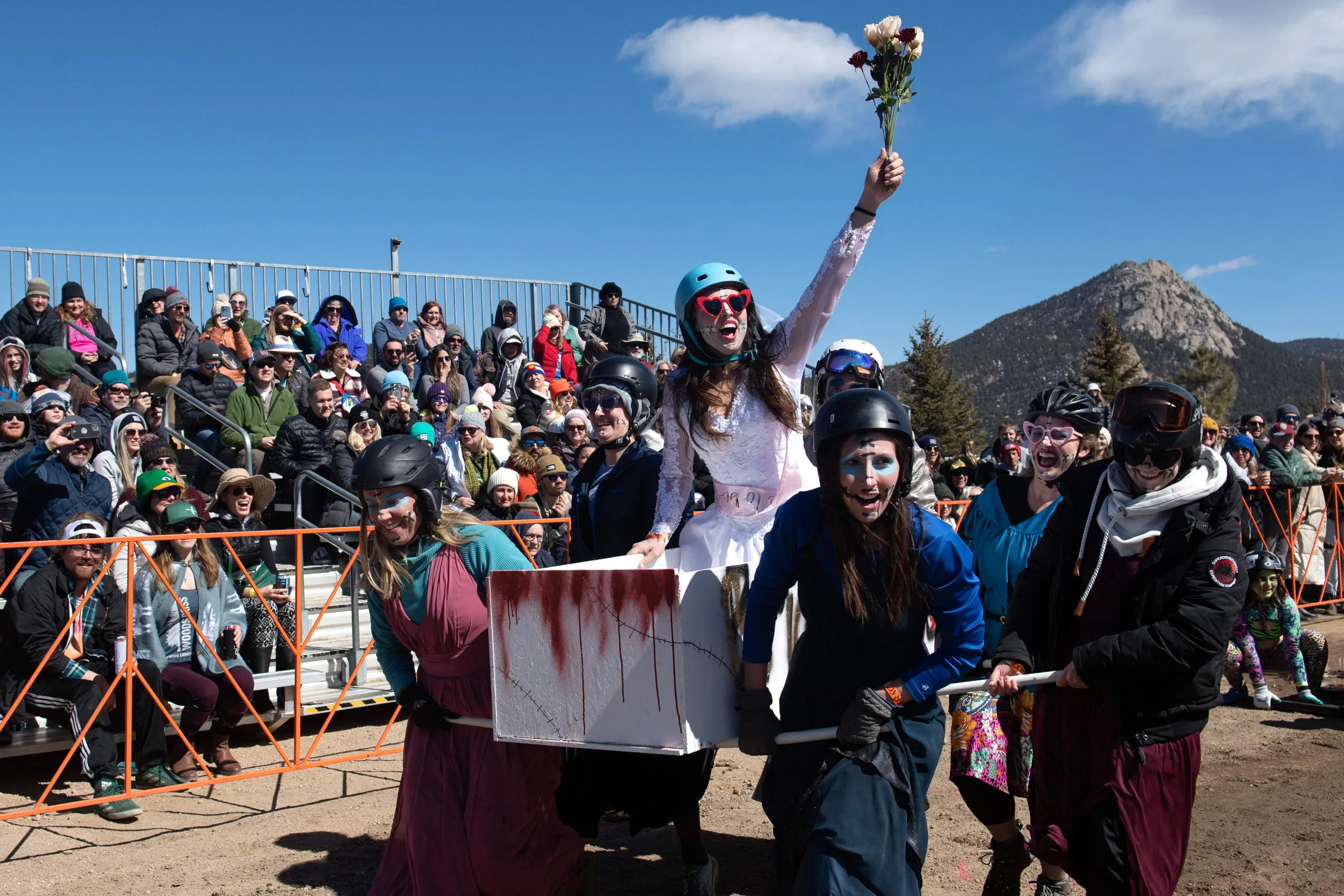 Shannon Carey (C) of Denver, Colorado, celebrates as her Bride or Die teammates carry her in a homemade coffin during the coffin races at the Frozen Dead Guy Days festival at the Estes Park Events Complex in Estes Park, Colorado, on March 18, 2023. The festival, which originally took place in Nederland, Colorado, began after the frozen body of a deceased Norwegian man, Bredo Morstøl, was found in a shed there. The body of Morstøl, who died in 1989, was cryogenically frozen by his family members and shipped to the United States. Legends about Morstøl became popular among Nederland, Colorado, residents, and they created this festival to honor him. (Photo by Jason Connolly/AFP Photo)