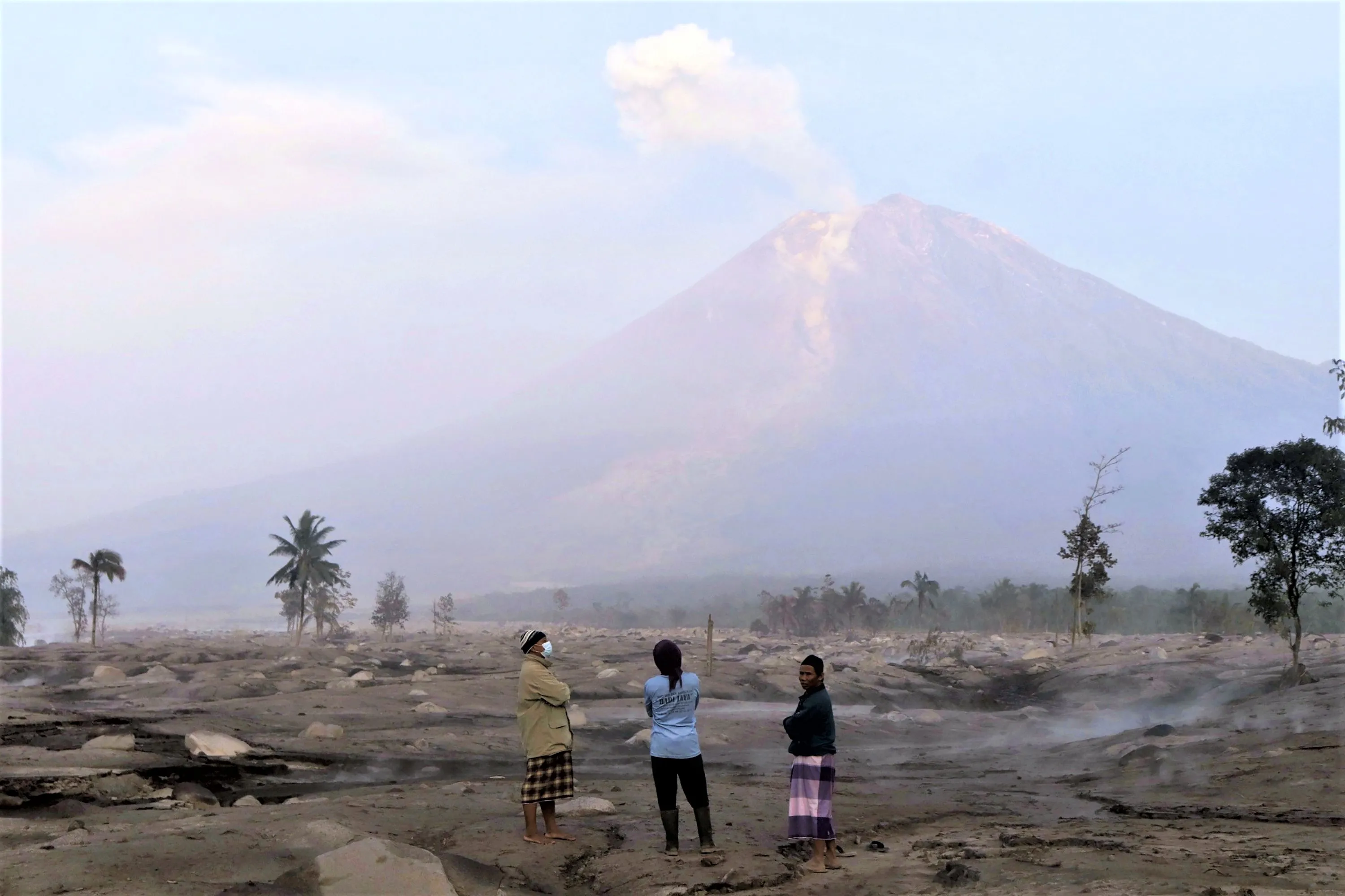 Villagers stand on an area covered in volcanic ash as Mount Semeru looms in the background in Kajar Kuning village in Lumajang, East Java, Indonesia, Monday, December 5, 2022. Indonesia's highest volcano on its most densely populated island released searing gas clouds and rivers of lava Sunday in its latest eruption. (Photo by Imanuel Yoga/AP Photo)