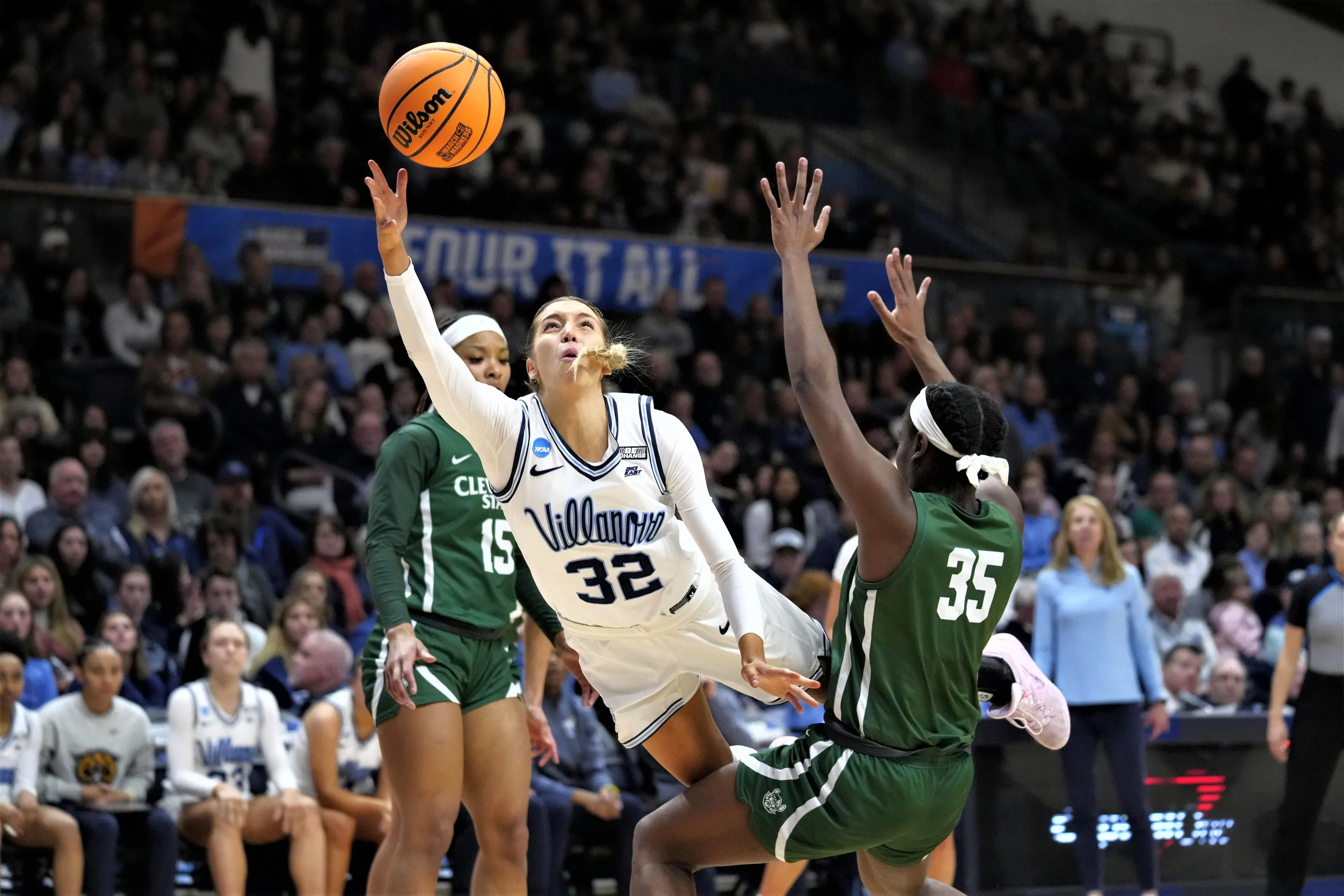 Villanova's Bella Runyan tries to shoot past Cleveland State's Amele Ngwafang during the second half of a first-round college basketball game in the NCAA Tournament, Saturday, March 18, 2023, in Villanova, Pa. (Photo by Matt Rourke/AP Photo)