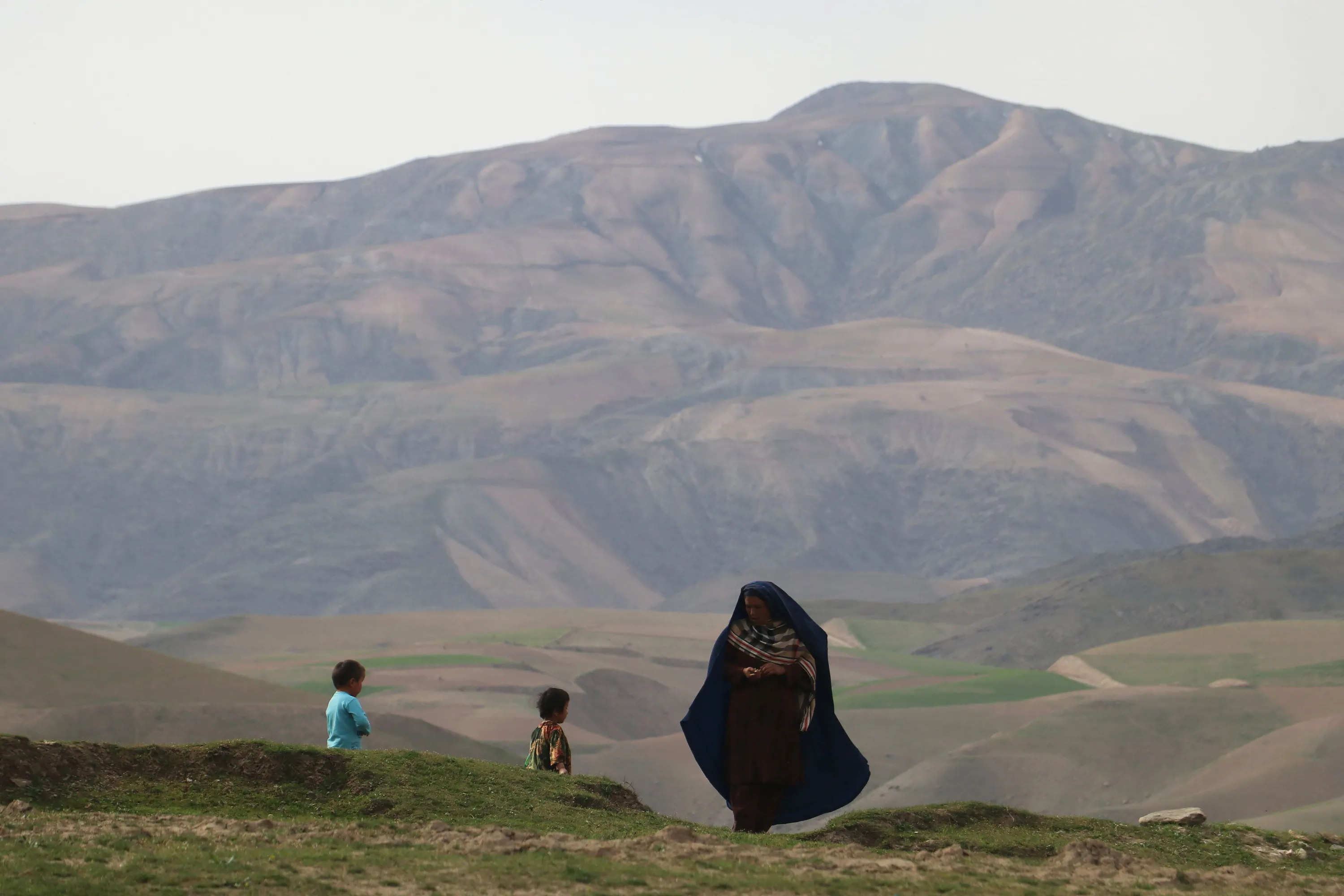A woman walks with her children in hillside in the Baghshah area of Fayzabad district, Badakhshan province, on March 14, 2023. (Photo by Omer Abrar/AFP Photo)