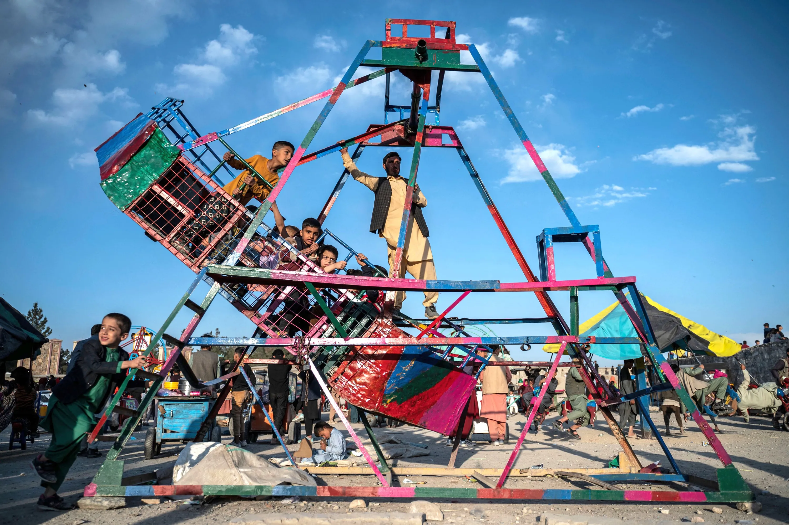 Afghan children enjoy a ride on a pirate ship attraction during “Nowruz”, the Persian New Year which was celebrated widely in Afghanistan before the Taliban returned to power but is now unacknowledged by the country's new rulers, in Kabul on March 21, 2023. (Photo by Wakil Kohsar/AFP Photo)