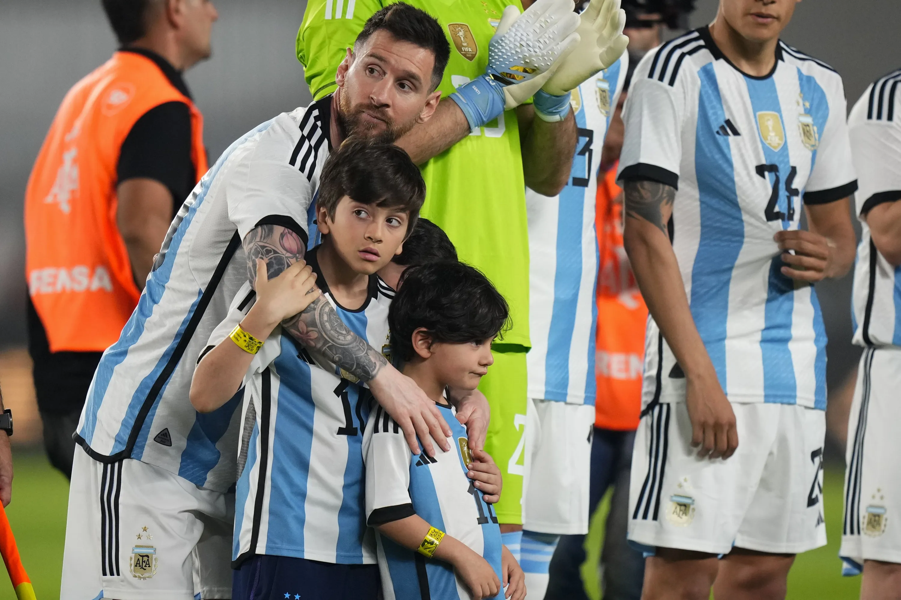 Argentina's Lionel Messi embraces his sons prior to an international friendly soccer match against Panama in Buenos Aires, Argentina, Thursday, March 23, 2023. (Photo by Natacha Pisarenko/AP Photo)