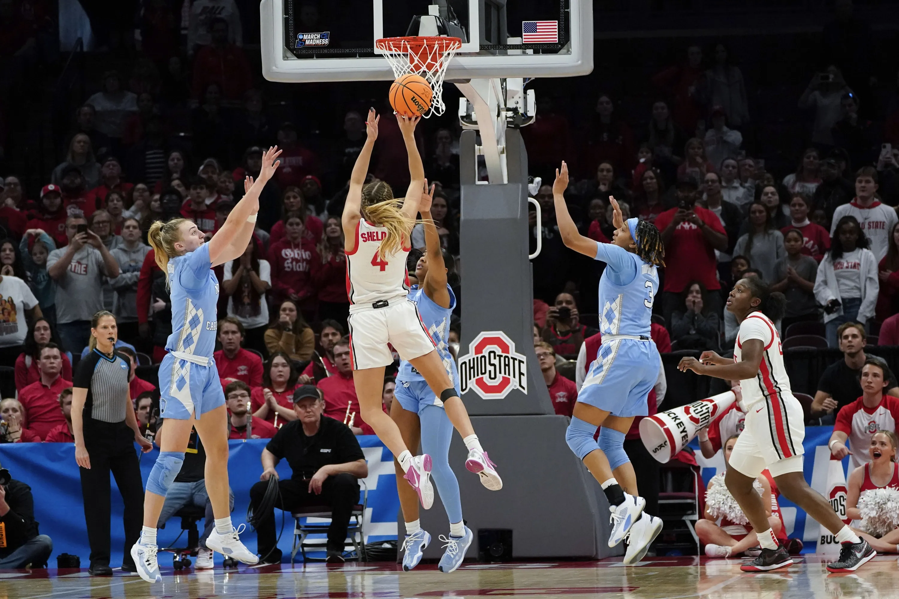 Ohio State guard Jacy Sheldon (4) hits the game winning shot against North Carolina in the second half of a second-round women's college basketball game in the NCAA Tournament Monday, March 20, 2023, in Columbus, Ohio. Ohio State won 71-69. (Phoot by Paul Sancya/AP Photo)