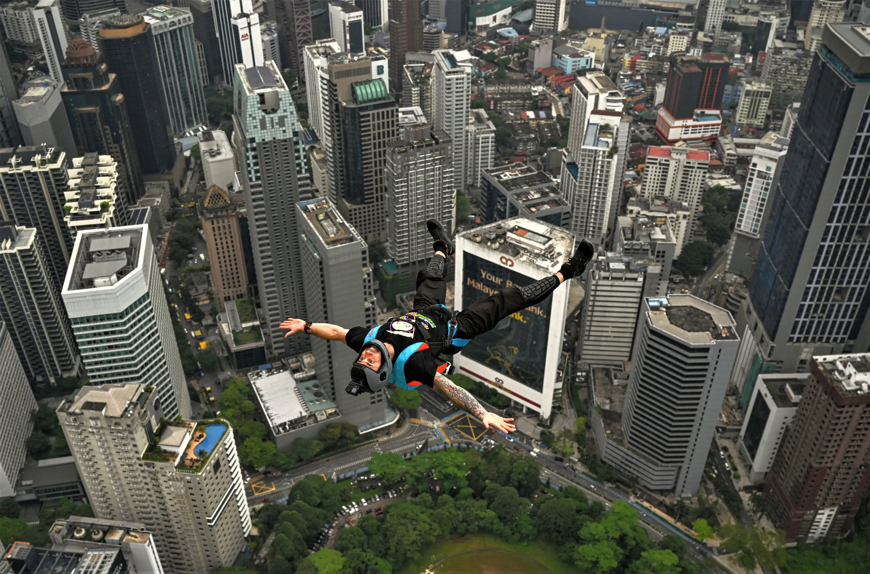 Base jumper Chris Mcdougall of Australia leaps from the 300-metre high open deck of Malaysia's landmark Kuala Lumpur Tower during the International Tower Jump in Kuala Lumpur on February 3, 2023. (Photo by Mohd Rasfan/AFP Photo)