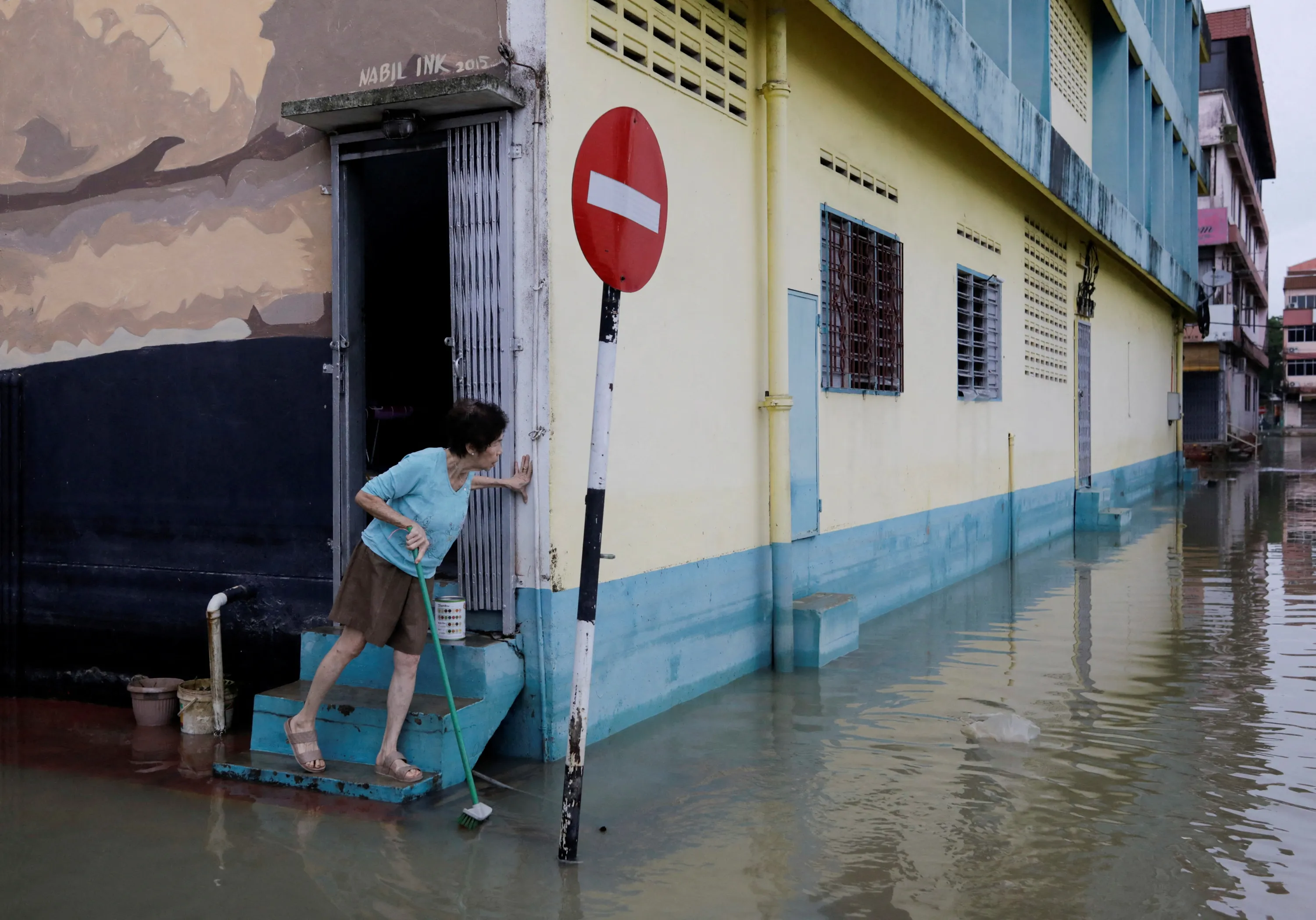 A woman checks the surrounding of her shophouse, as the floodwaters recede, in Kota Tinggi, Johor, Malaysia on March 5, 2023. (Photo by Hasnoor Hussain/Reuters)
