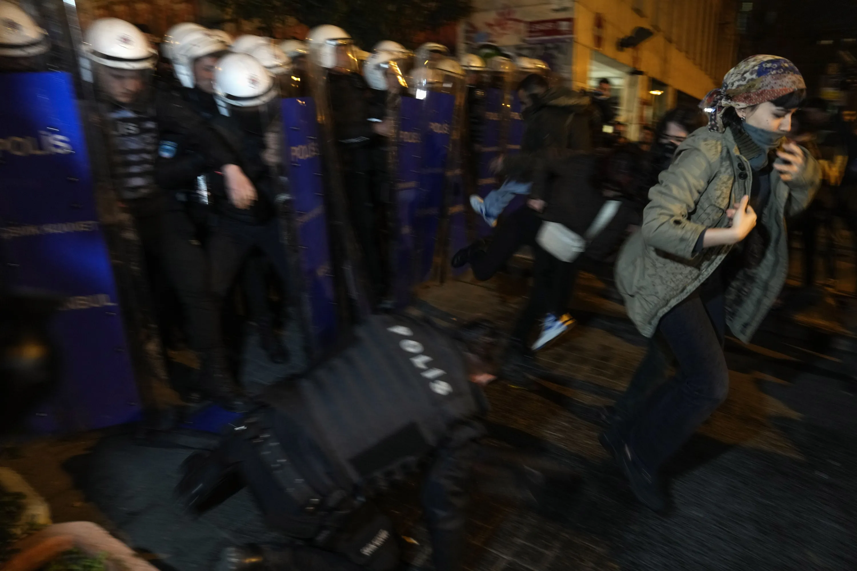 Protesters scuffle with anti riot policemen at the end of the gathering to mark the International Women's Day in Istanbul, Turkey, Wednesday, March 8, 2023. Women in Turkey and their allies converged on a central Istanbul neighborhood to demonstrate for women's rights and protest the human-made toll of the deadly quake that hit Turkey a month ago. (Photo by Khalil Hamra/AP Photo)