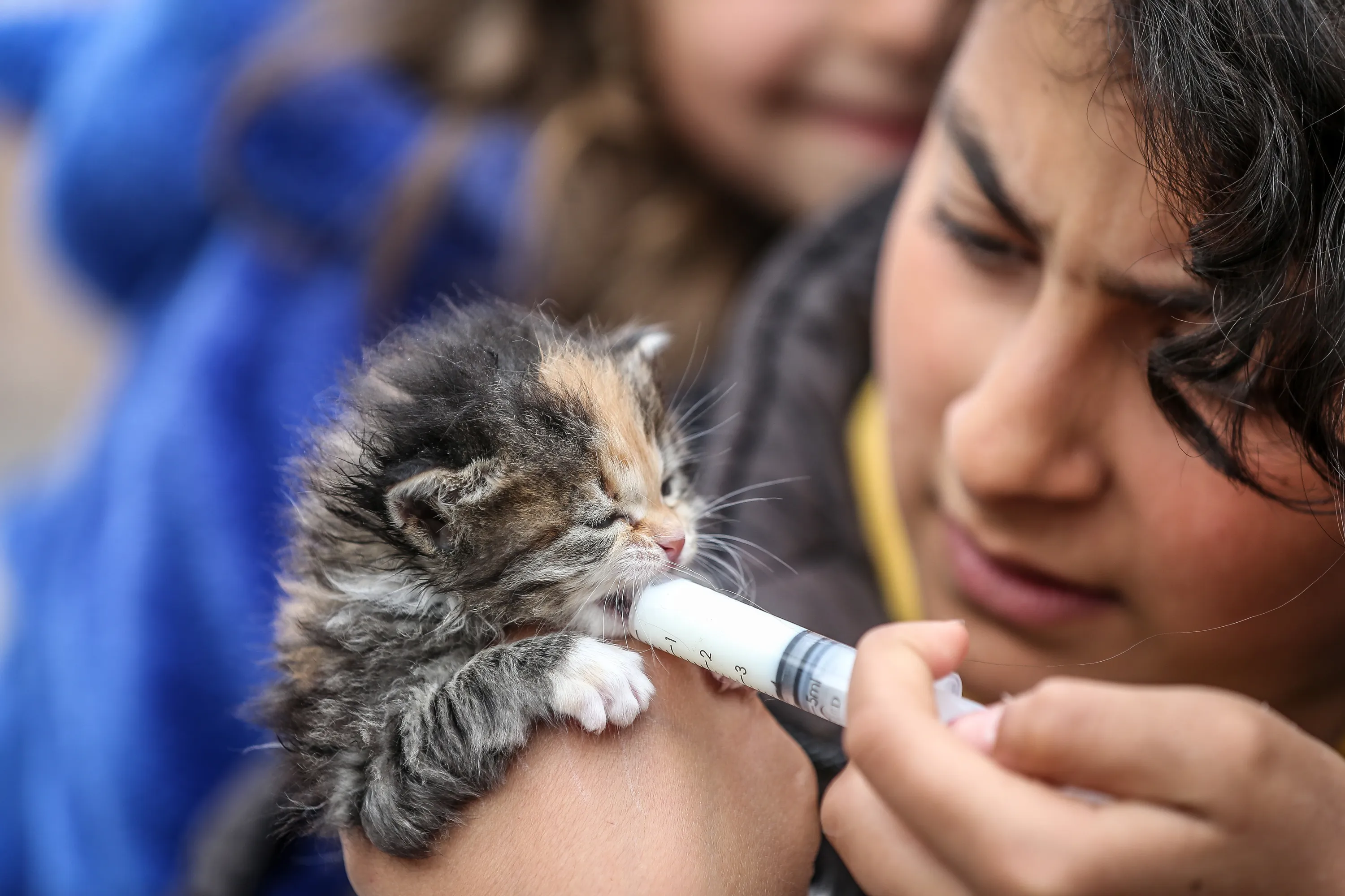A girl feeds the new-born kitten as the family, living in tent city, adopted two kittens, found under the rubble, after 7.7 and 7.6 magnitude earthquakes hit in Hatay, Turkiye on March 15, 2023. (Photo by Sergen Sezgin/Anadolu Agency via Getty Images)