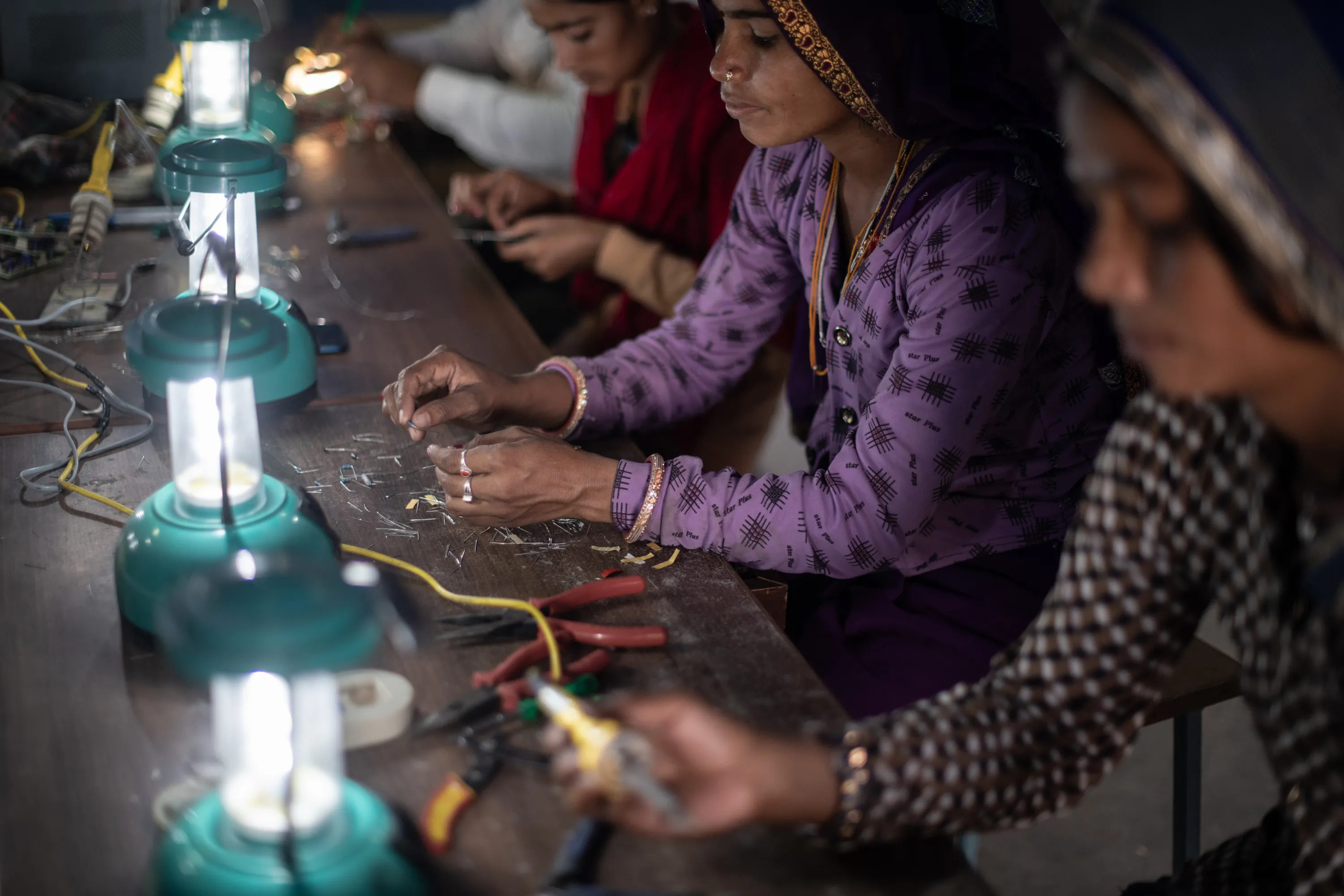 Indian villagers assemble solar lamps in a class held as part of the Barefoot Solar Project to bring solar powered lighting to rural areas on March 25, 2023 in Solawata, India. The college focuses on expanding access to electricity to help reduce poverty in rural and marginalised communities, training women to make and install solar lamps and lighting systems to bring clean solar energy to remote villages. (Photo by Rebecca Conway/Getty Images)