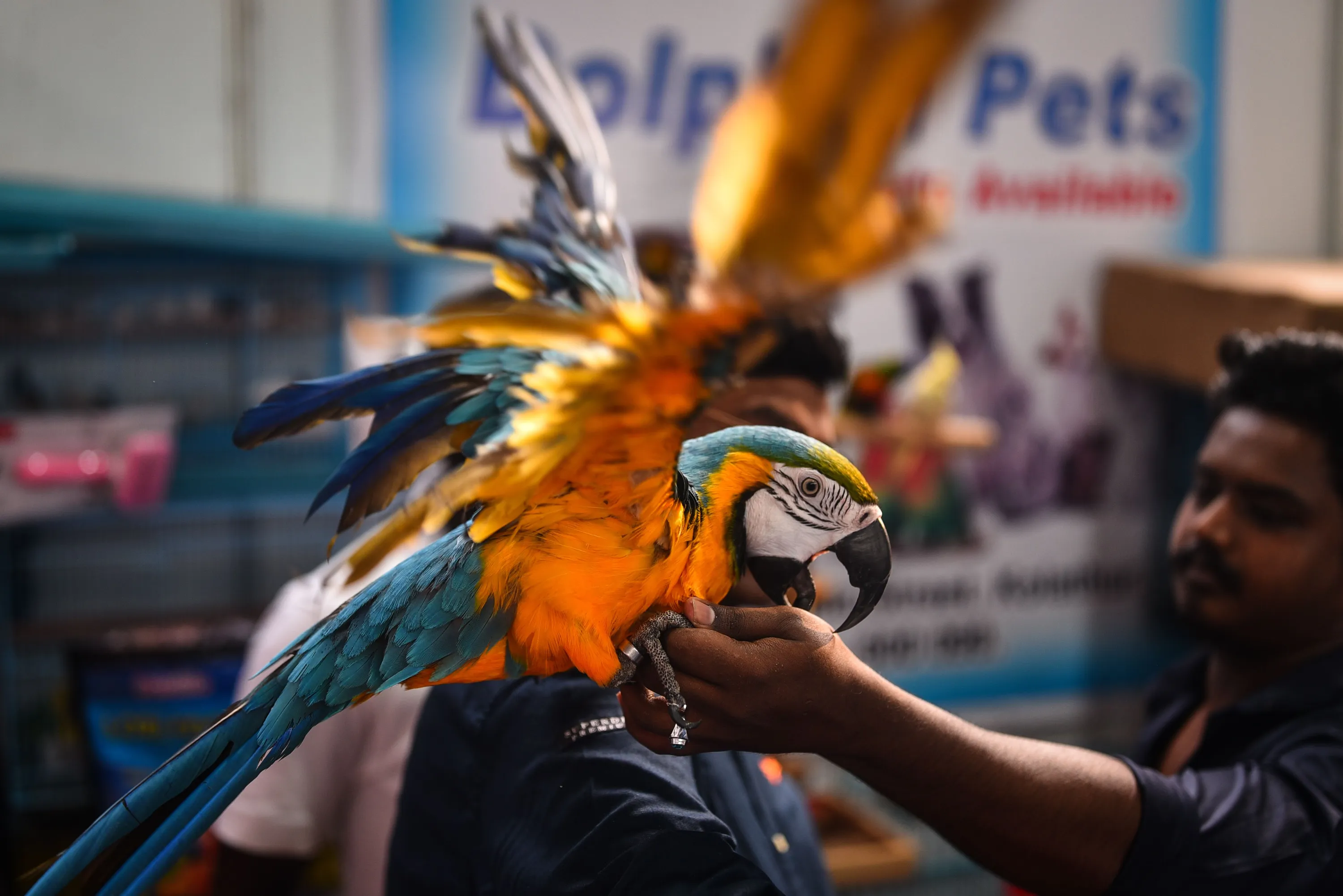 A visitor holds a macaw during the PetXpo Chennai 2023 pet exhibition, in Chennai, India, 26 March 2023. The two-day pet expo organized by the pet industry aims at presenting products as well as giving pet enthusiasts the opportunity to socialize and bond with pets. (Photo by Idrees Mohammed/EPA/EFE/Rex Features/Shutterstock)