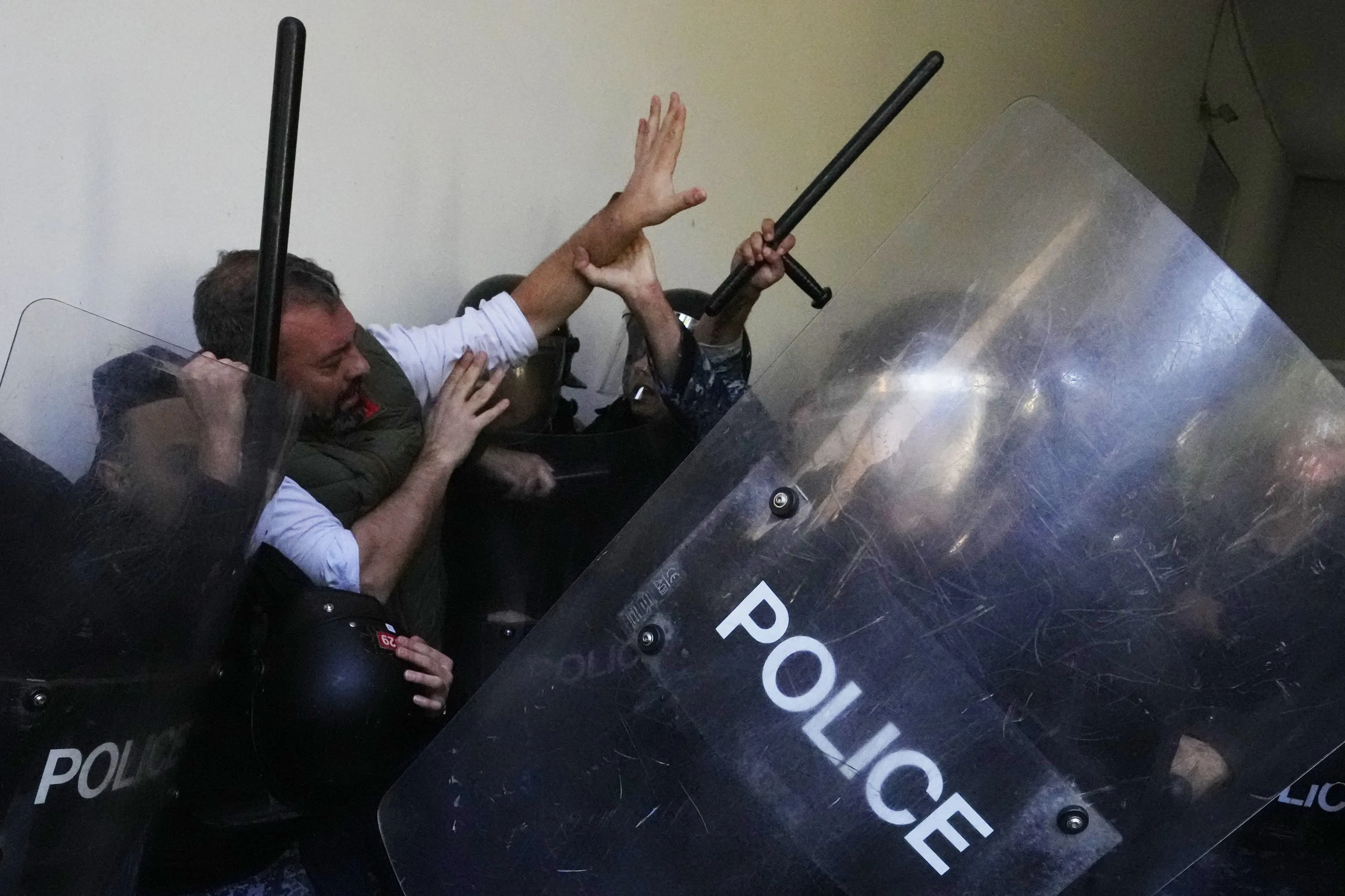 Anti-government protesters scuffle with riot police outside the ministry of Justice, in Beirut, Lebanon, Thursday, January 26, 2023. Scores of protesters Thursday scuffled with riot police as they tried to break into the Beirut Justice Palace, rejecting an order from Lebanon's judiciary that further crippled the probe into a massive port explosion over two years ago. (Photo by Hassan Ammar/AP Photo)