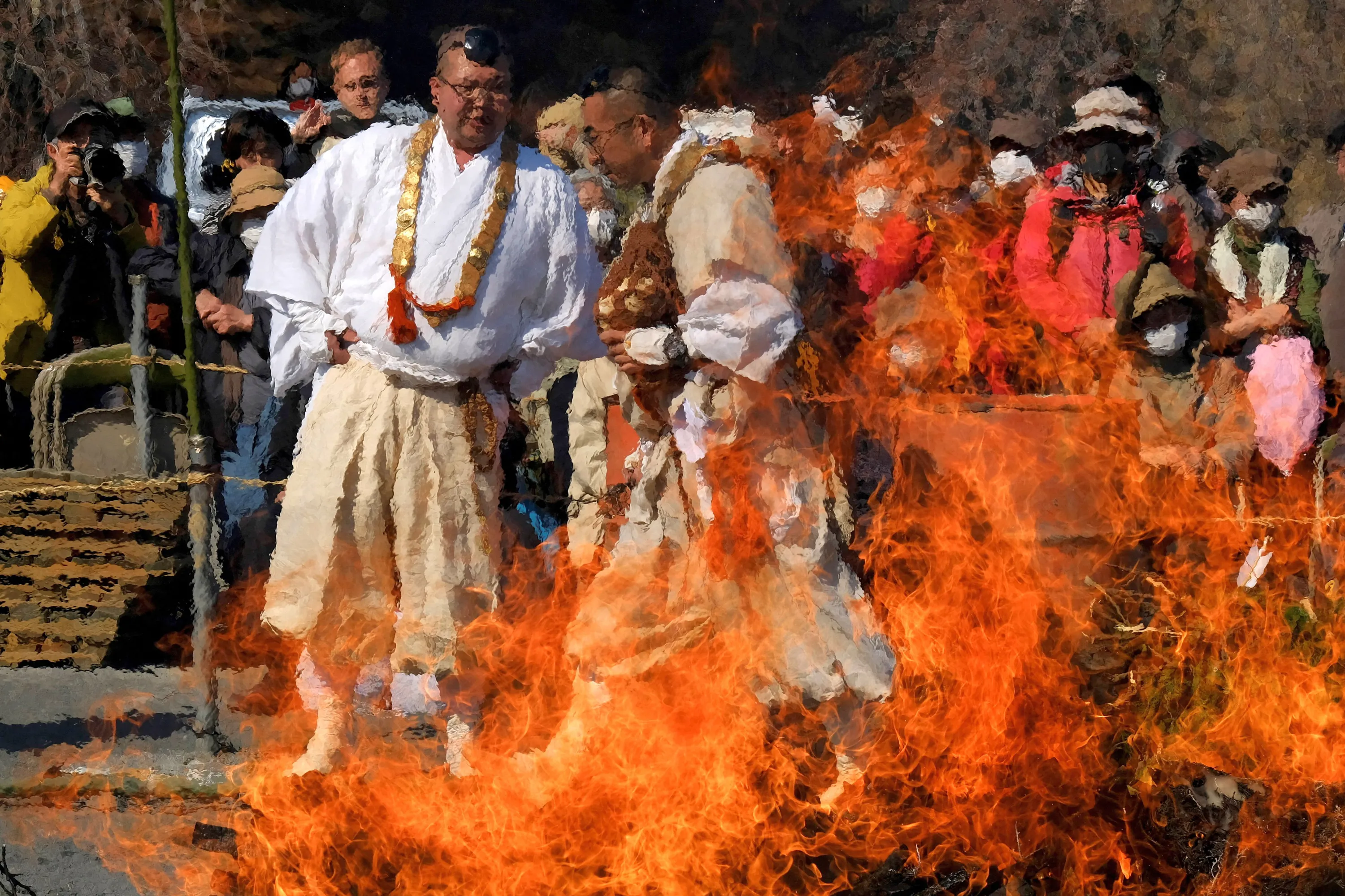 Buddhist monks take part the Nagatoro Hi-Matsuri, or fire walking festival, to pray for good health and safety in Nagatoro town, Saitama prefecture on March 5, 2023. (Photo by Kazuhiro Nogi/AFP Photo)