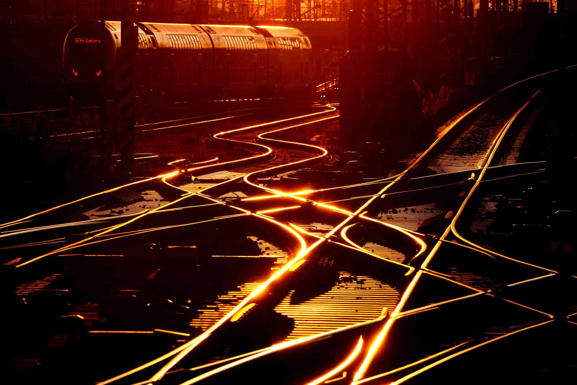A train is parked outside a train station in Frankfurt, Germany as the sun sets on Monday, January 23, 2023. (Photo by Michael Probst/AP Photo)