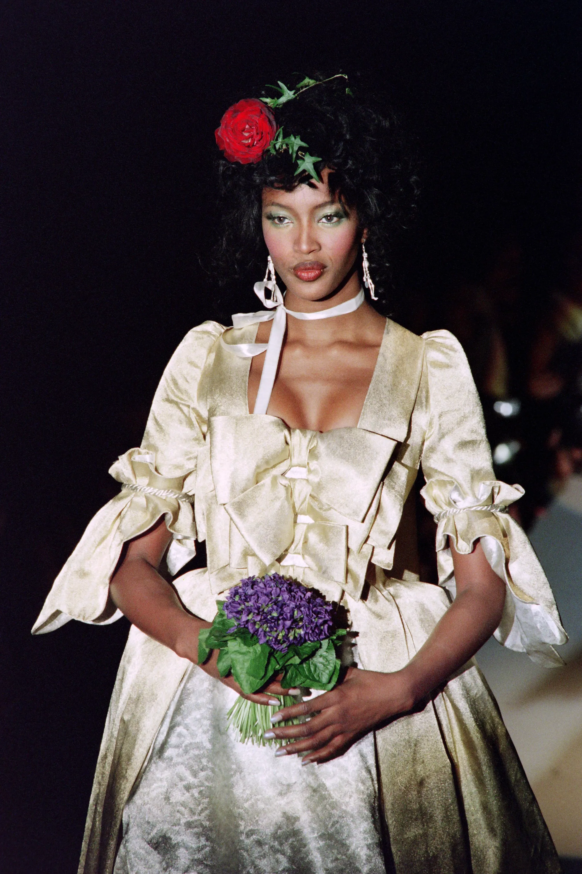 British model Naomi Campbell displays a creation on March 18, 1995 at the Louvre Carrousel in Paris in Paris as part of the Vivienne Westwood's 1995/1996 Fall/Winter ready-to-wear collection presentation. (Photo by Gérard Julien/AFP Photo)