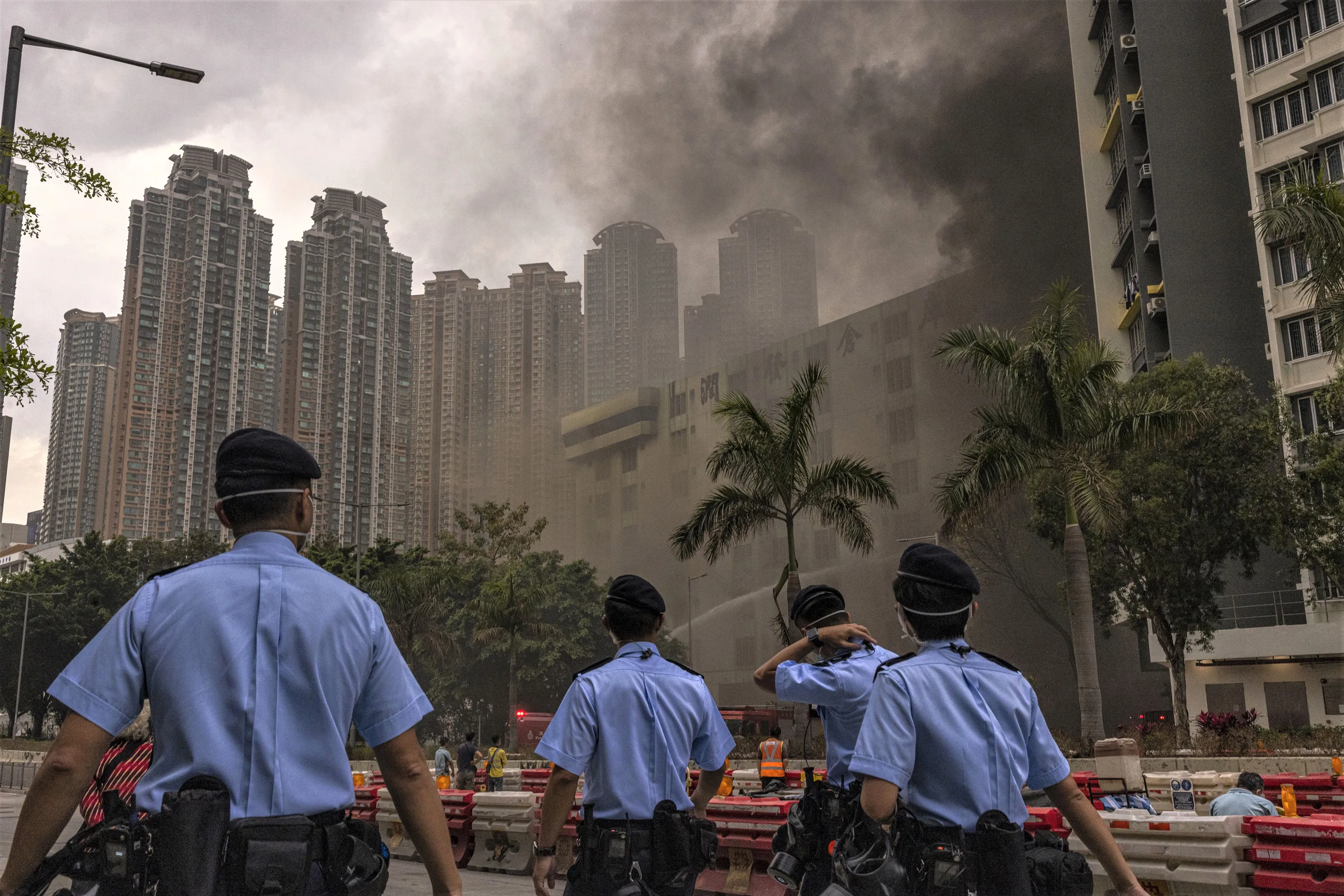 Police officers patrol as a warehouse burns in Cheung Sha Wan in Hong Kong, Friday, March 24, 2023. Hong Kong firefighters were battling a blaze Friday at a warehouse that forced 3,400 people to evacuate, including students, police said. (Photo by Louise Delmotte/AP Photo)